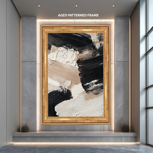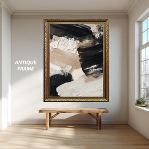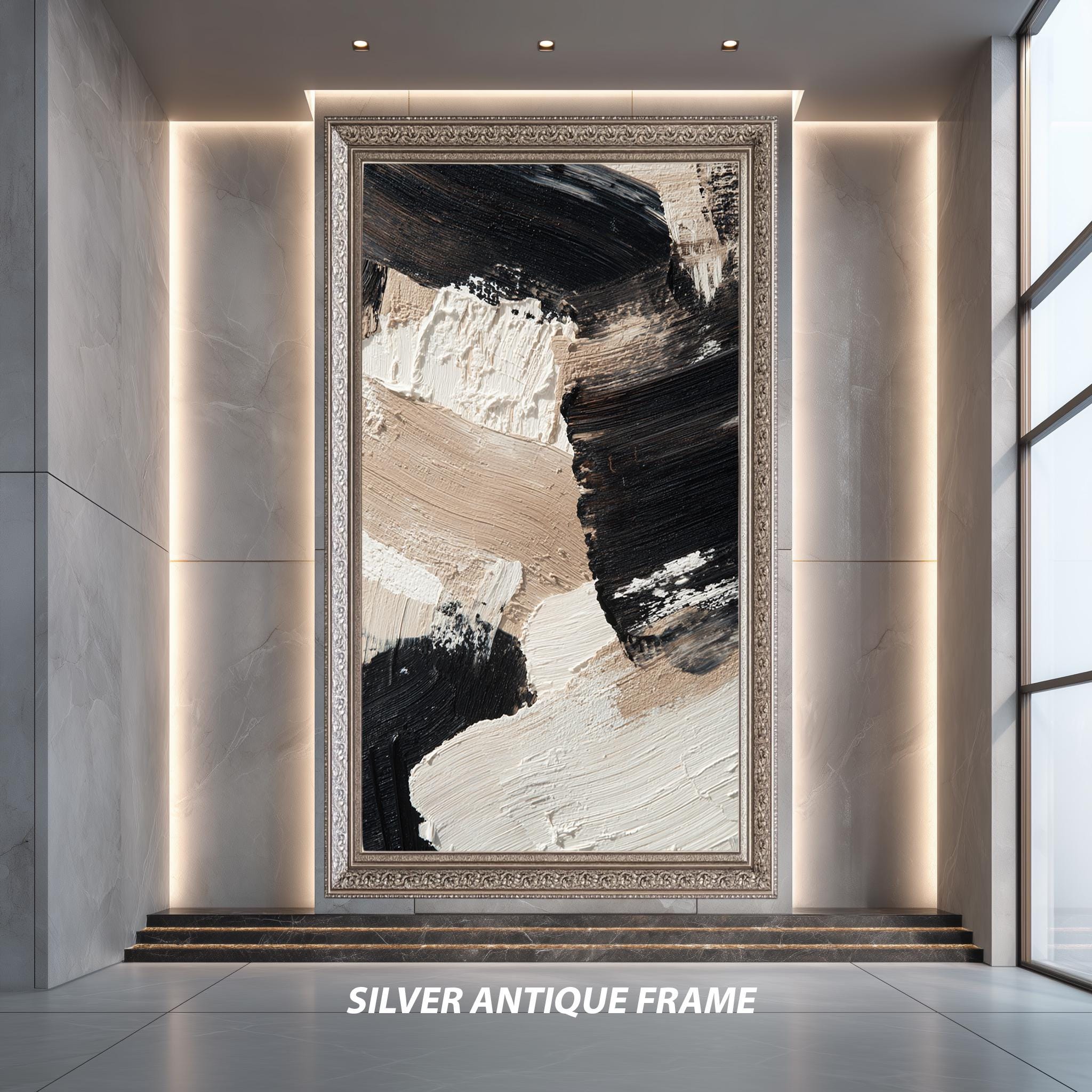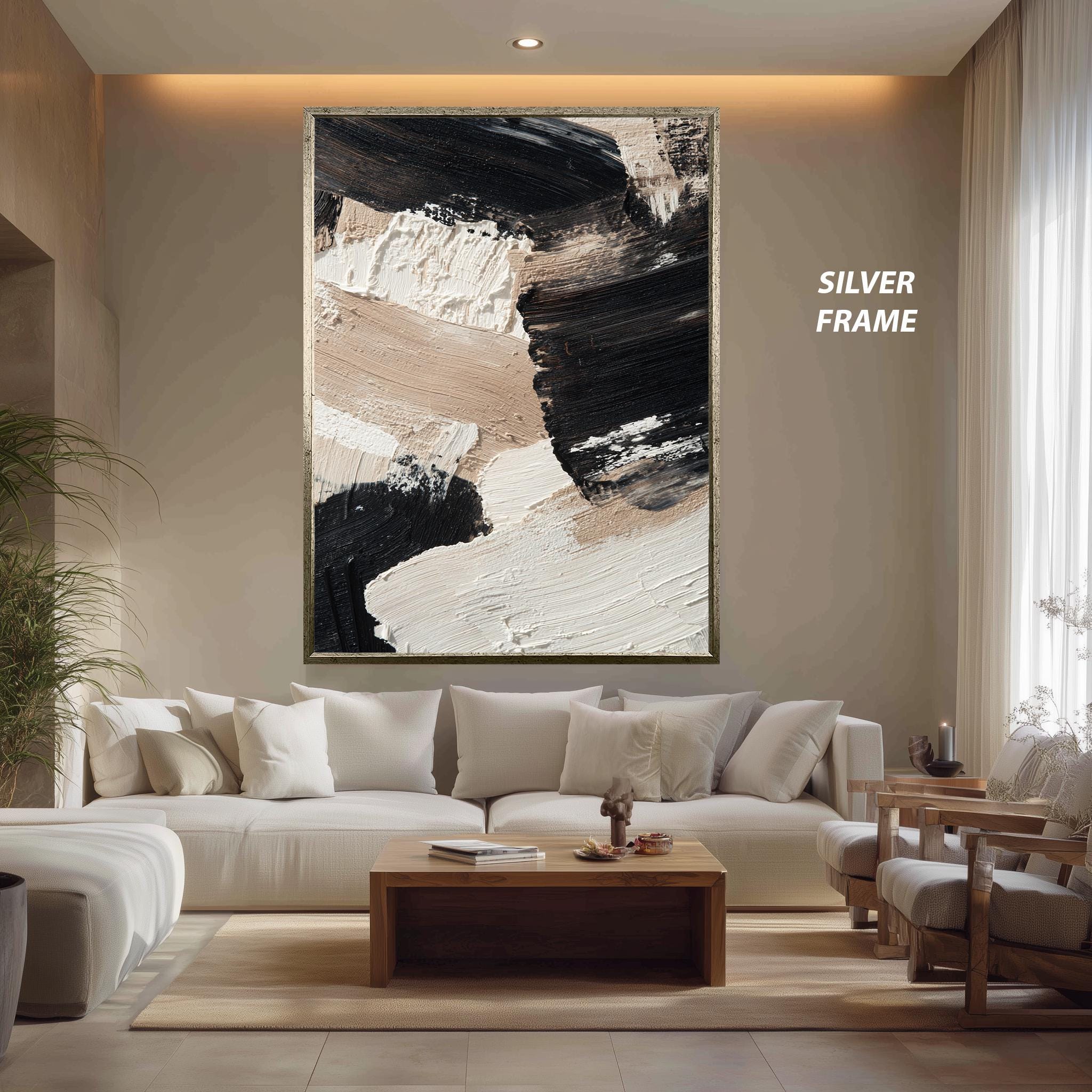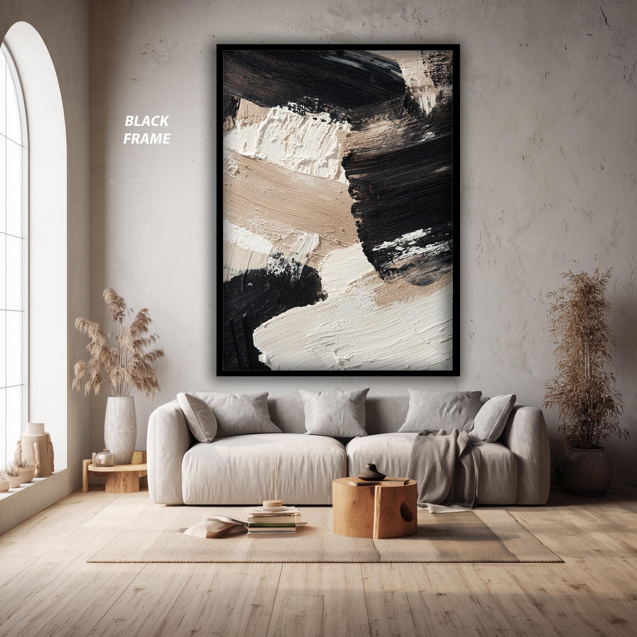 Crafted to meet high standards, this black beige art measures from 8"x12" (20x30cm) up to an impressive 59"x98" (150x250cm), allowing you to choose the perfect size for your room. The canvas is stretched over wooden bars for a sleek finish or can be shipped rolled for custom framing options. Available frame choices include classic and luxury styles such as gold, silver, black, white, brown, aged gold, antique gold, and antique silver.