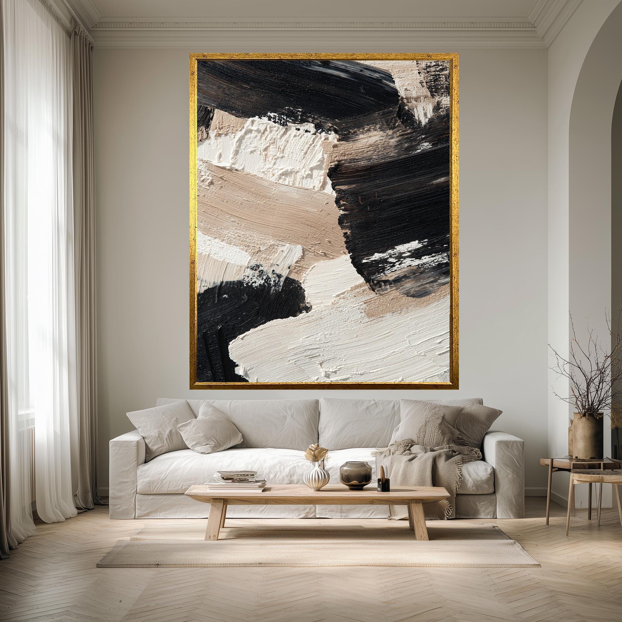 This contemporary abstract painting is ideal for those who appreciate the emotional impact of abstract expressionism art combined with clean minimalist design. The deep black contrasts subtly with beige tones to create a calming yet striking presence in any room. Whether used as office wall decor or living room artwork, this piece enhances mid century modern decor themes while maintaining timeless appeal.