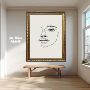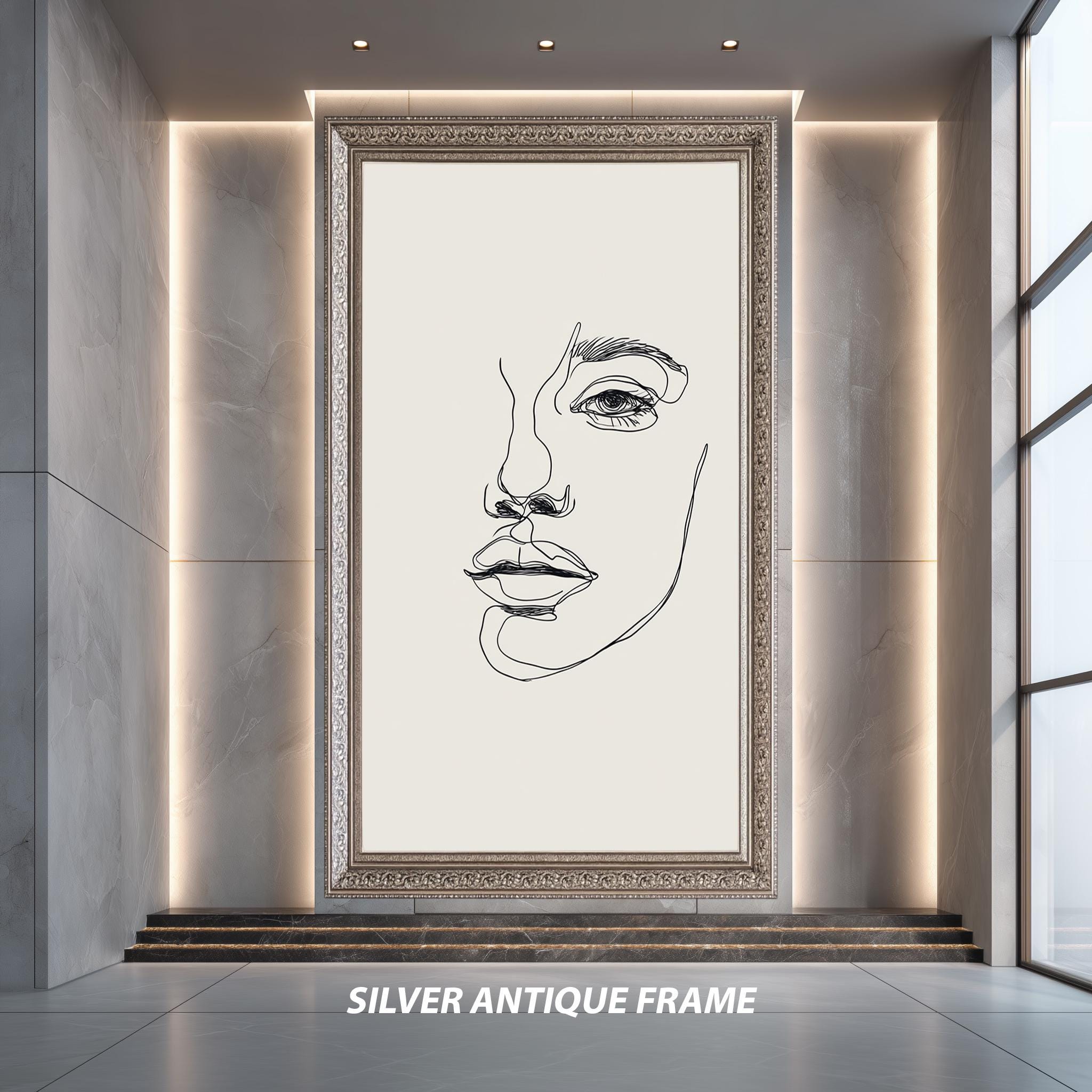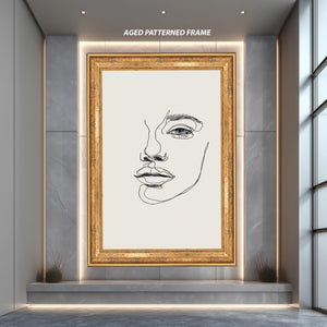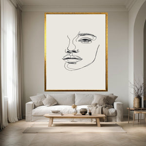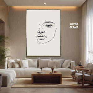 Crafted with precision, this contemporary face illustration measures from 8"x12" (20x30cm) up to 59"x98" (150x250cm), allowing you to select the perfect size for your space. Choose between roll (unframed) for custom framing or stretched canvas gallery-wrapped on wooden bars, ready to hang. Frame options include classic tones like Gold, Silver, Black, White, Brown and luxury finishes such as Aged Gold, Antique Gold, and Antique Silver.