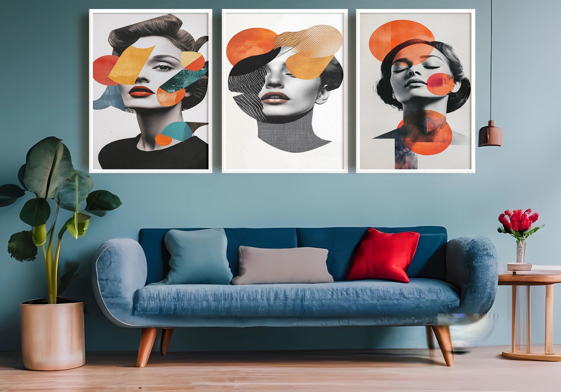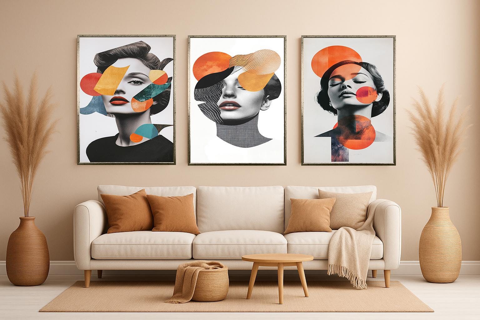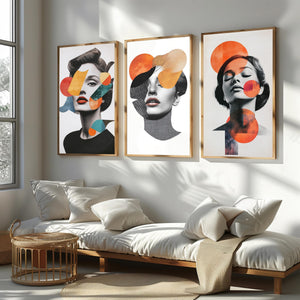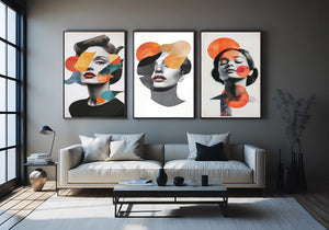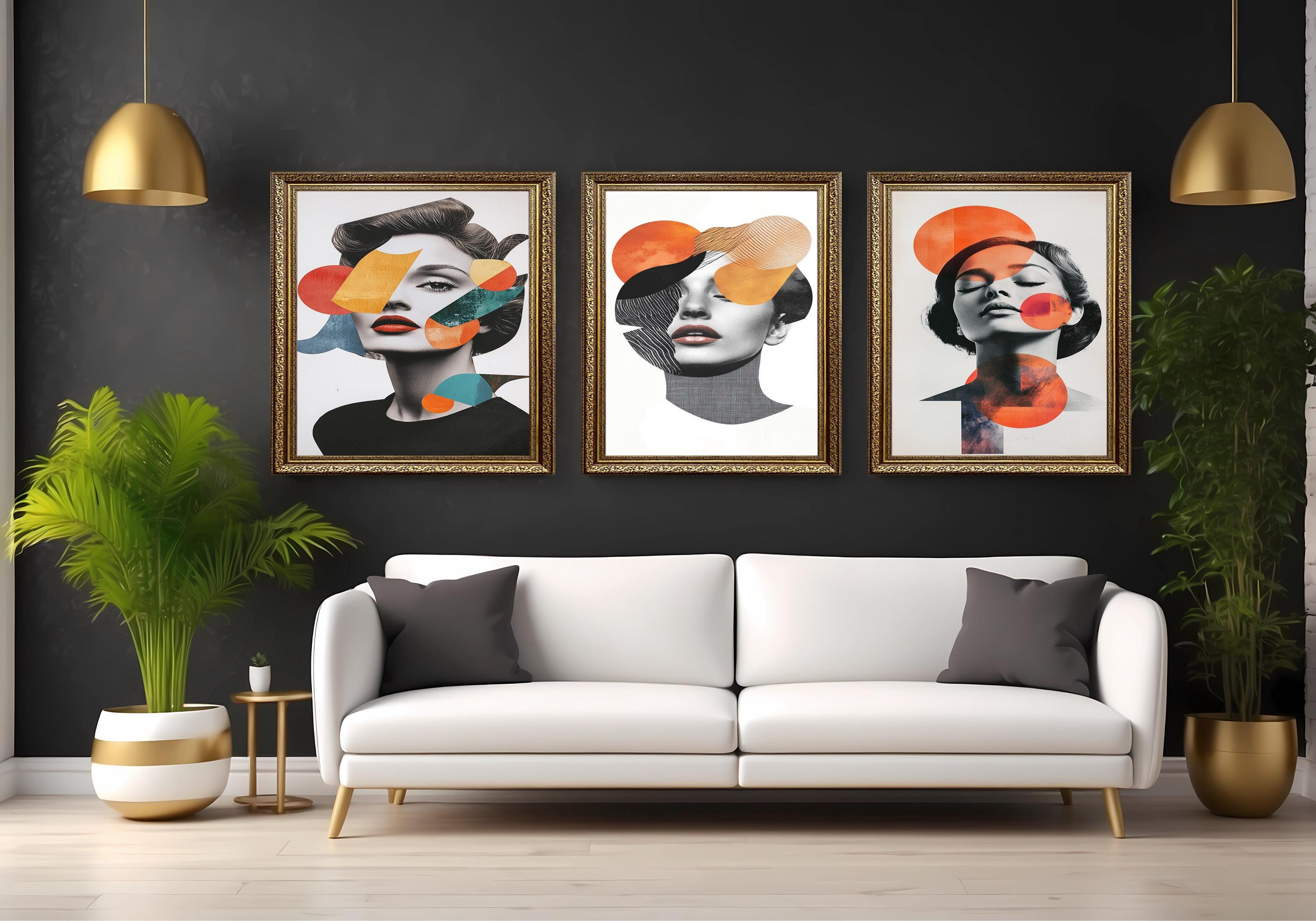 - Three-piece set of black and white portraits showcasing abstract woman portrait designs