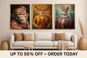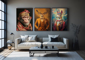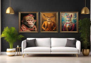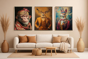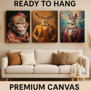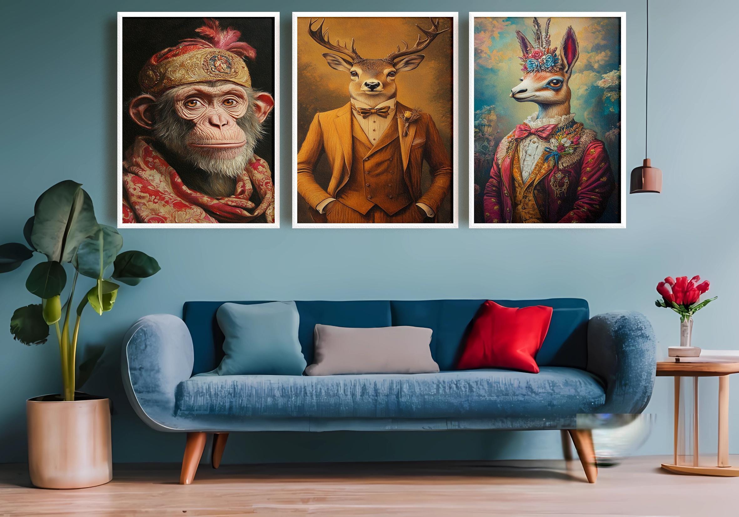Discover our exquisite animal portrait prints, a whimsical wall art collection that brings vintage canvas set charm and eclectic home decor style to your space. This 3-piece set features anthropomorphic art with dressed animal paintings, including a stately deer in formalwear, a floral crown llama bursting with color and detail, and a royal chimp artwork draped in ornate robes. Each piece is printed on premium cotton canvas, delivering rich colors and intricate textures that elevate any gallery wall art or quirky animal decor collection.