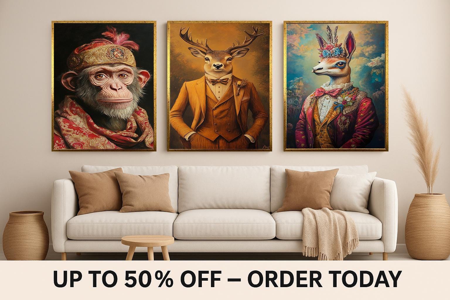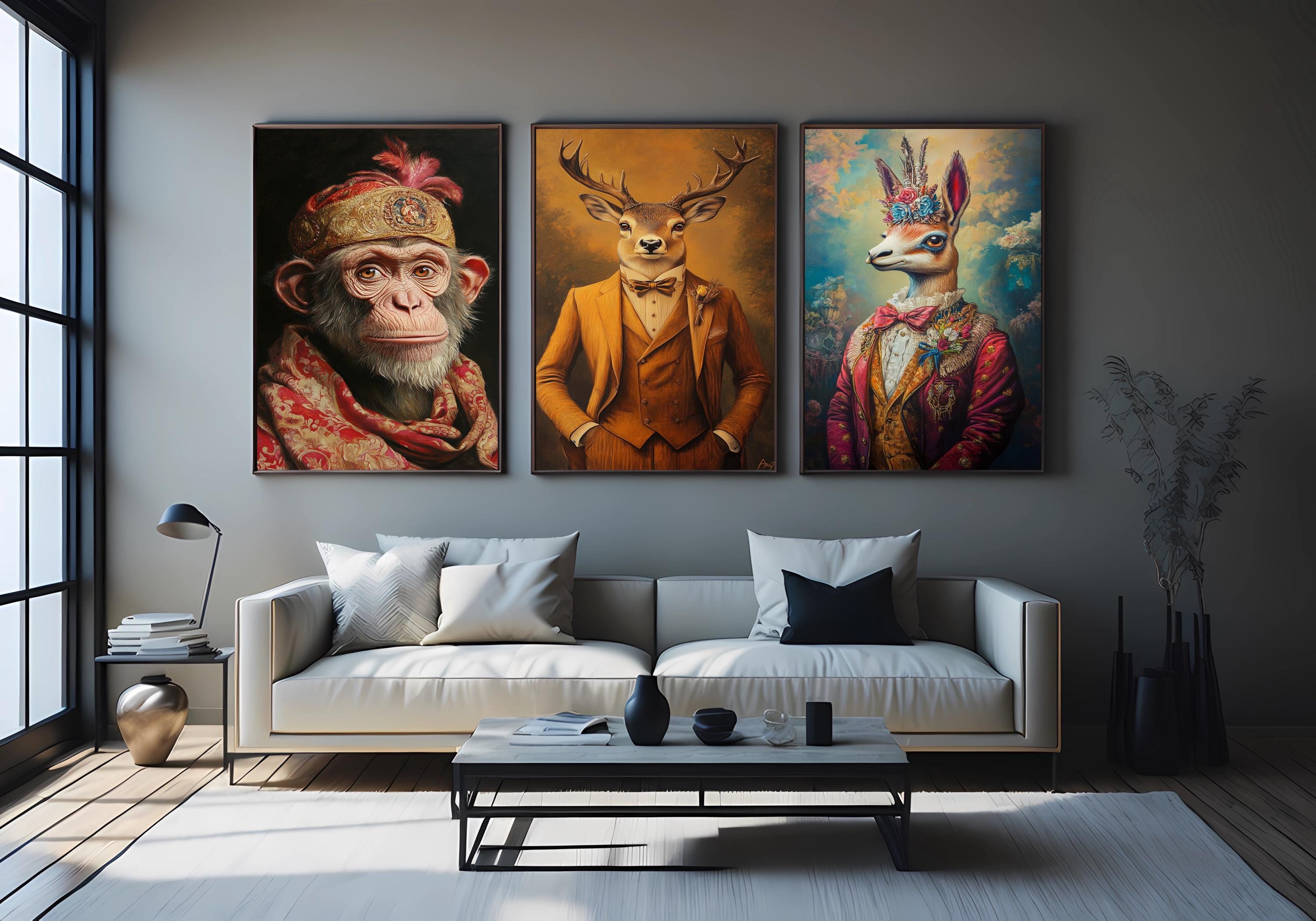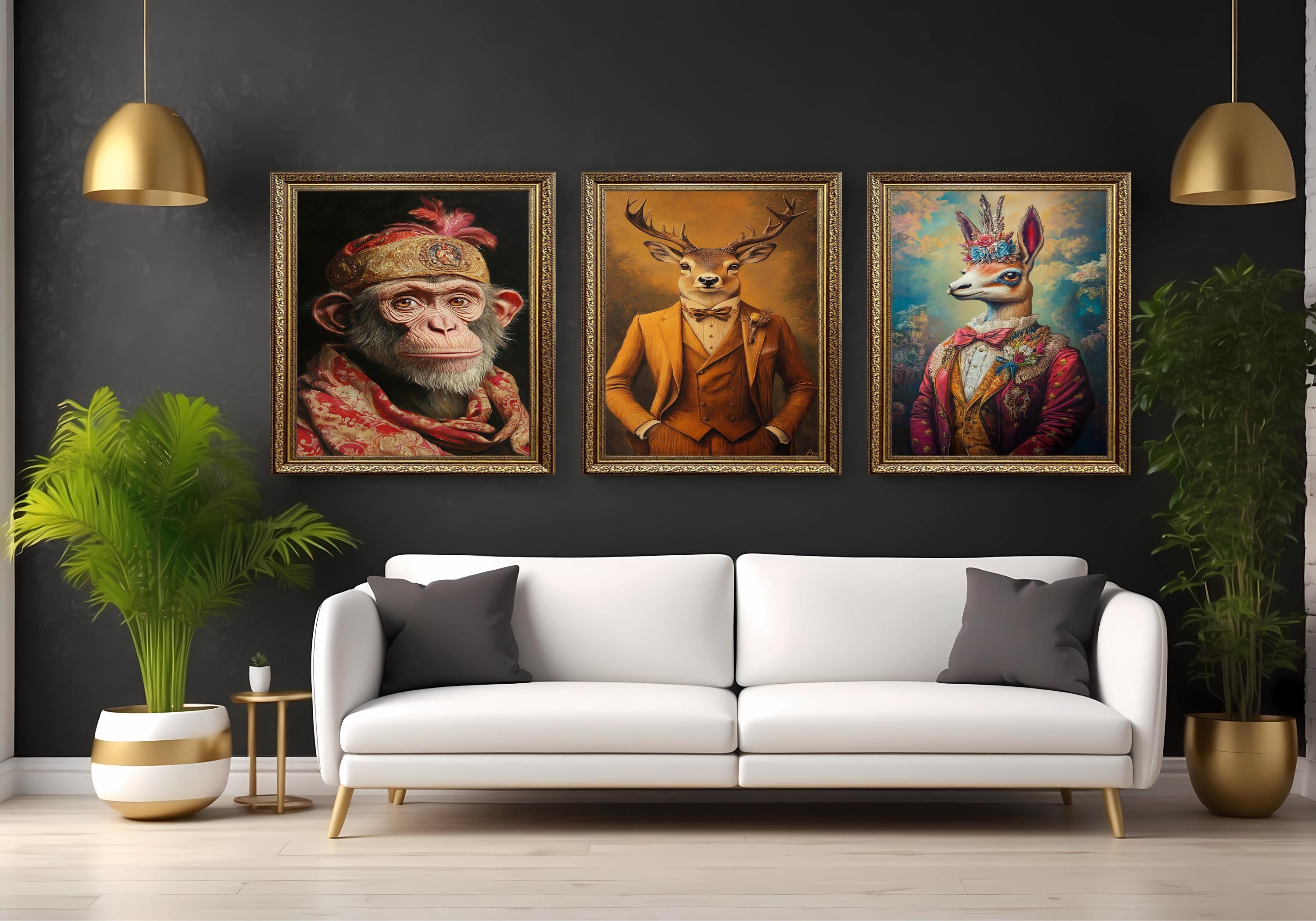- Three unique animal portraits: Deer in suit, floral crown llama, royal chimp artwork