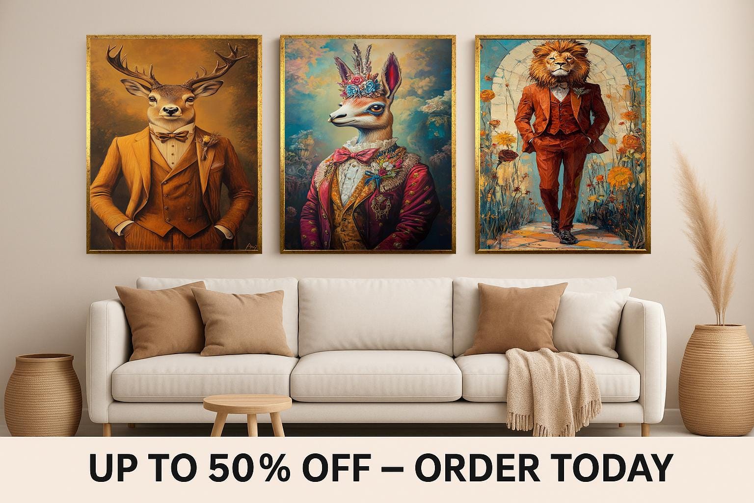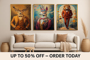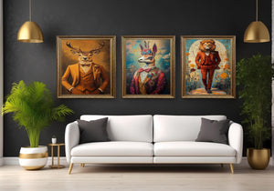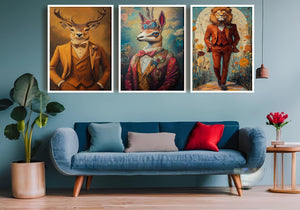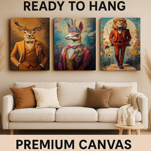 Discover the charm of anthropomorphic animal art with this whimsical wall art collection featuring dressed animal portraits that bring personality and style to any space. This vintage canvas prints set includes a floral llama print, a lion in suit artwork, and a deer vintage portrait, each crafted to enhance your eclectic home decor art with quirky animal decor that stands out.