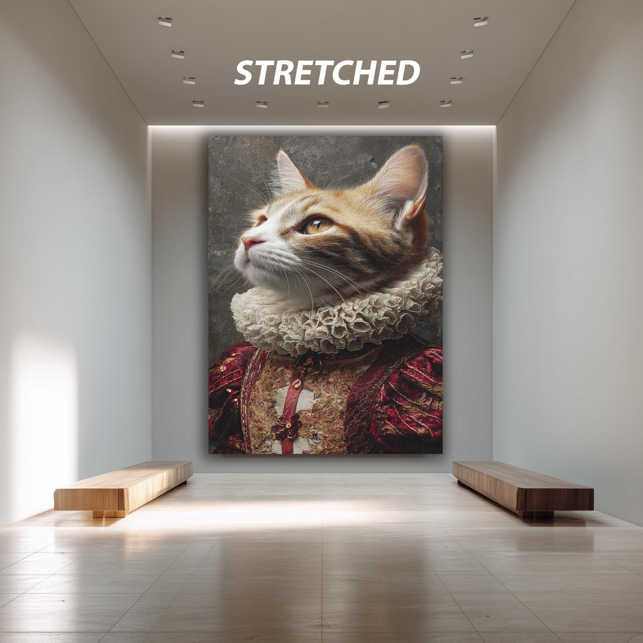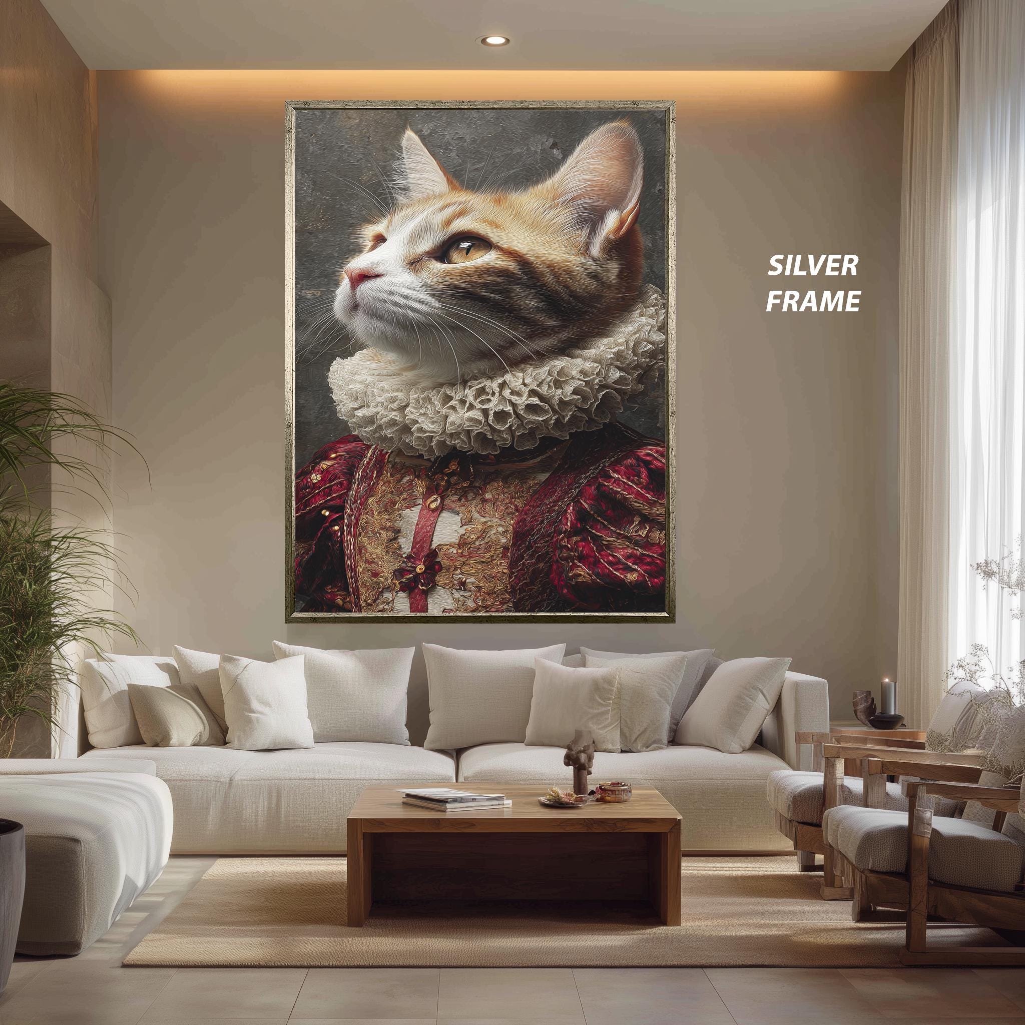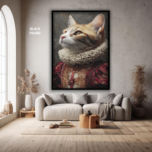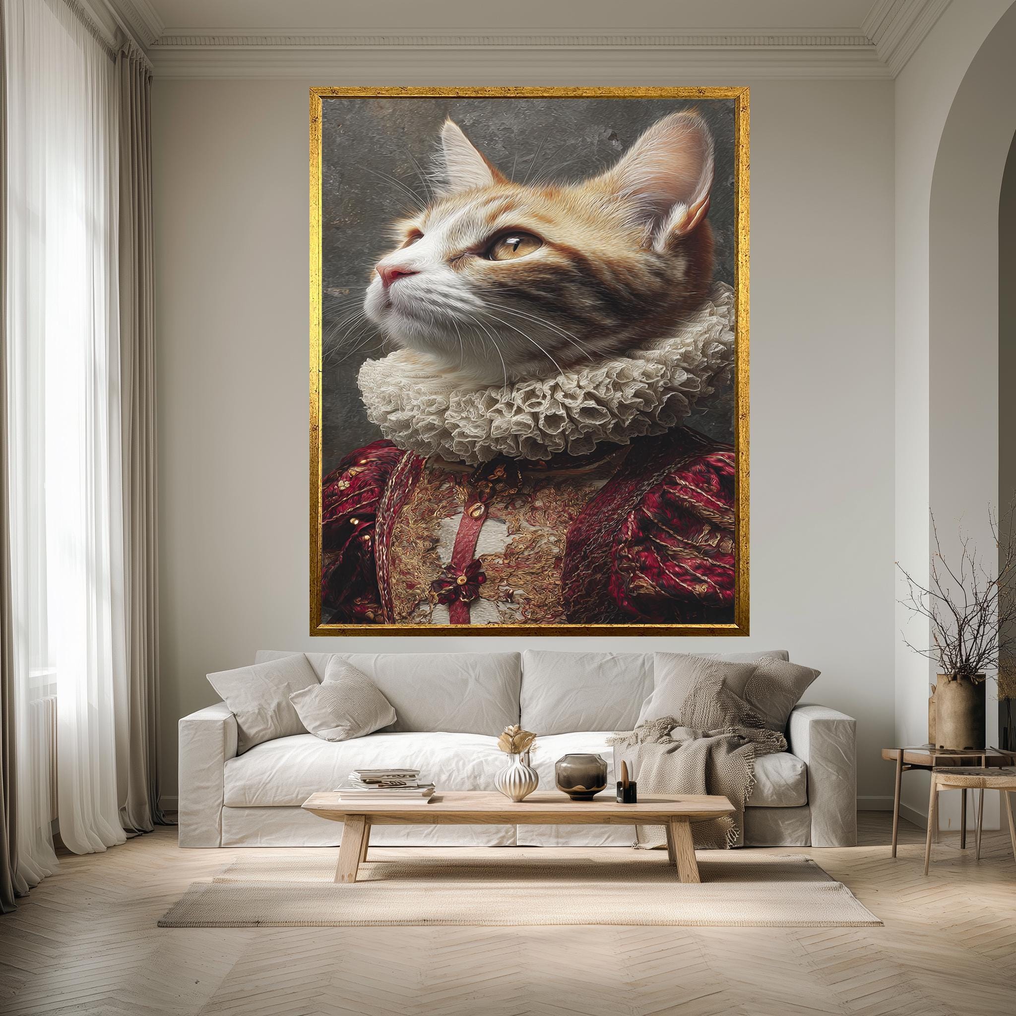 The Aristocratic Cat Portrait showcases a charming feline dressed in a Royal Renaissance Outfit, making it the perfect Funny Animal Wall Art that adds a touch of whimsy and elegance to any space. This Noble Cat Decor print brings a playful yet sophisticated vibe, ideal for cat lovers and art enthusiasts seeking unique Pet Portrait Art that stands out. Measuring up to 59"x98" (150x250cm), this Renaissance Cat Print is crafted with premium materials to ensure lasting beauty and vibrant colors.