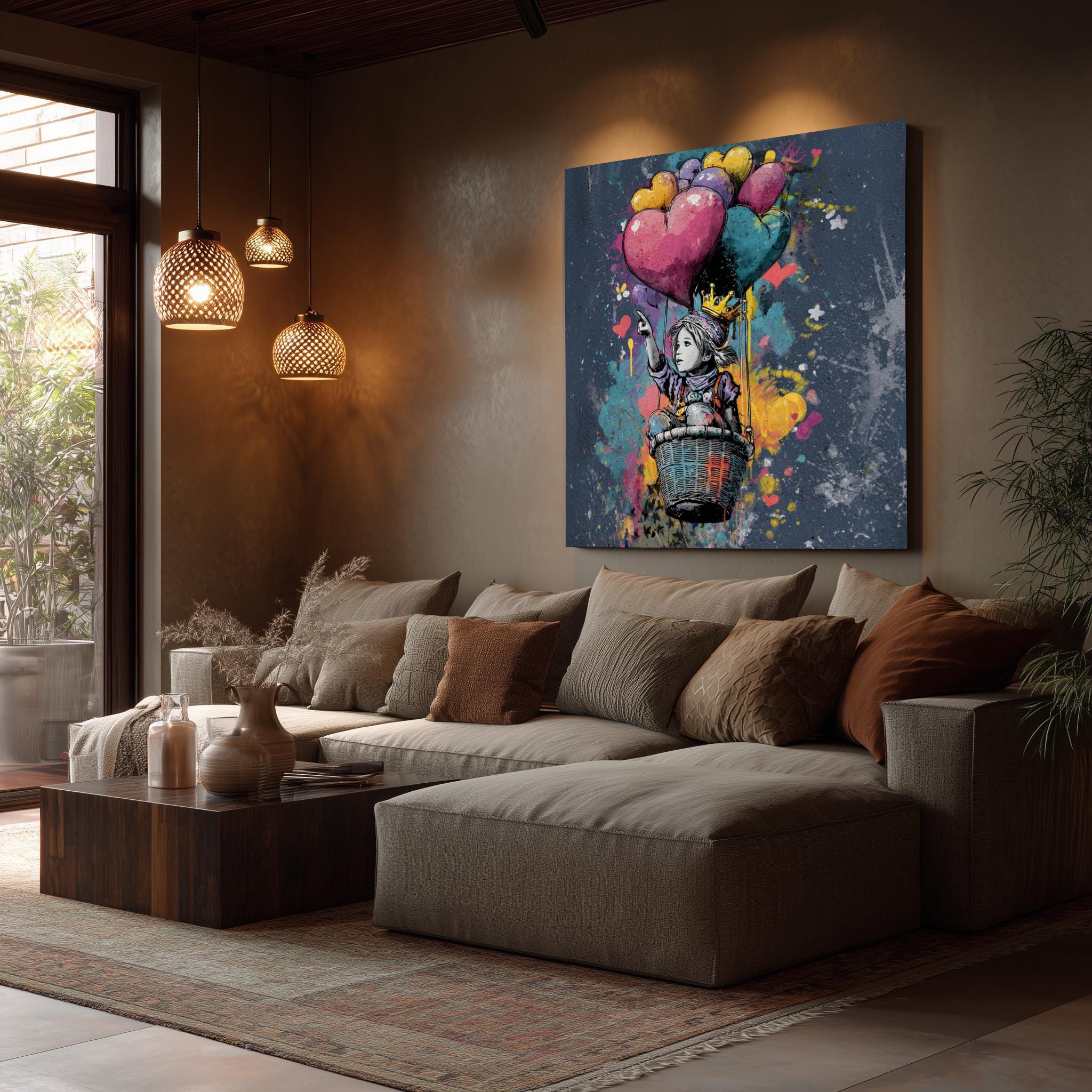 Bring home this divine love artwork to create an inspiring environment filled with peace and creativity. Its blend of colorful graffiti decor and spiritual art poster qualities makes it versatile for various interior styles. Embrace the charm of this balloon street art print and let its whimsical heart balloon artwork brighten your walls with hope and serenity.