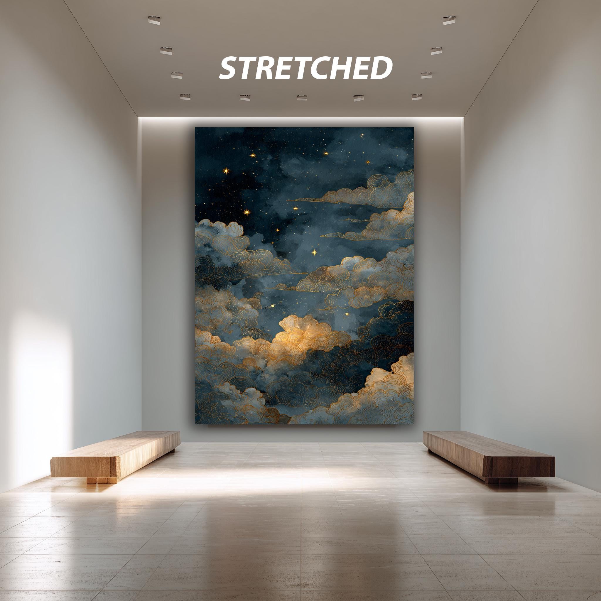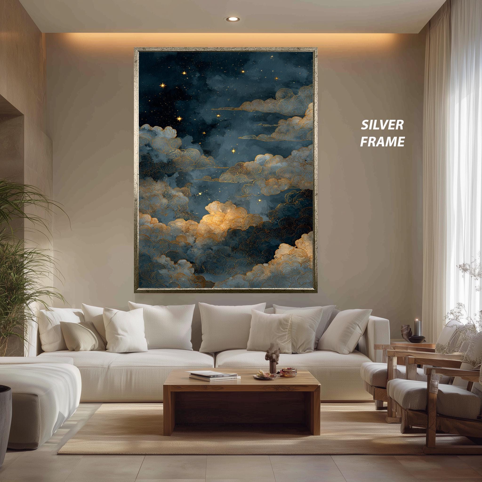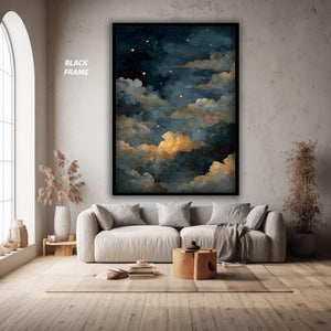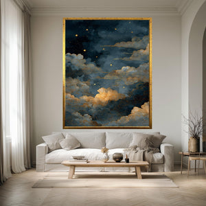 The Golden Celestial Cloud Canvas Wall Art is a stunning celestial canvas wall art piece that brings the starry night sky into your home or office. This dreamy blue and gold cosmic artwork transforms any space with its vibrant hues and sophisticated design, delivering a peaceful and inspiring atmosphere. Perfect for lovers of abstract expressionism art, this modern canvas print offers a unique blend of color and emotion that elevates minimalist wall decoration and mid century art piece themes.