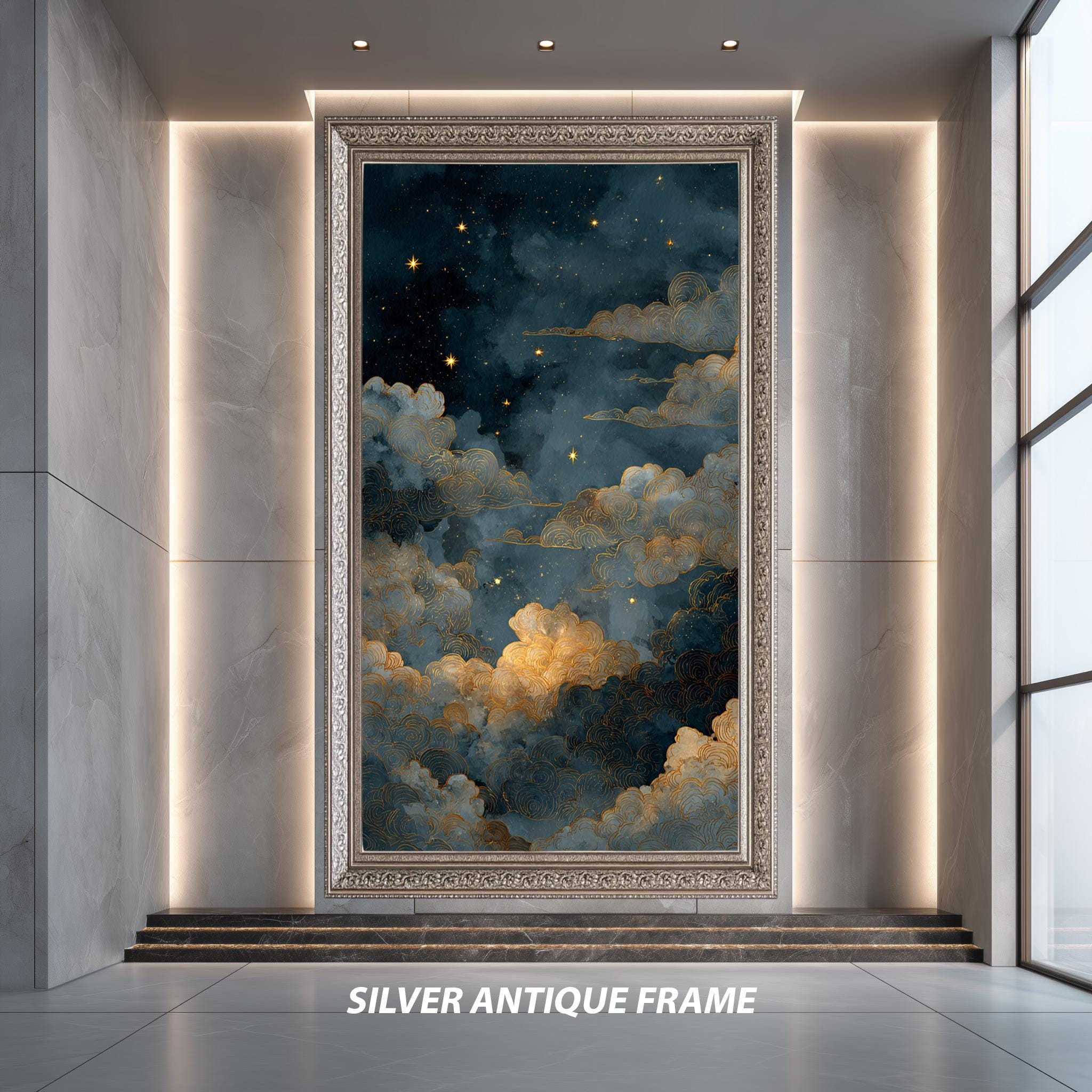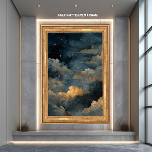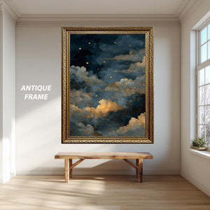 Printed on museum-quality gallery wrapped canvas, this starry night print features deep blues contrasted with shimmering golds to create a captivating cosmic sky artwork. The digital sky painting technique ensures sharp details and vivid colors that last, making it an ideal dreamy bedroom art or luxury framed canvas for your living space. Choose from multiple sizes ranging from 8"x12" (20x30cm) up to 59"x98" (150x250cm), with options for roll (unframed), stretched canvas, or various frame styles including classic gold, silver, black, white, brown, or antique finishes.