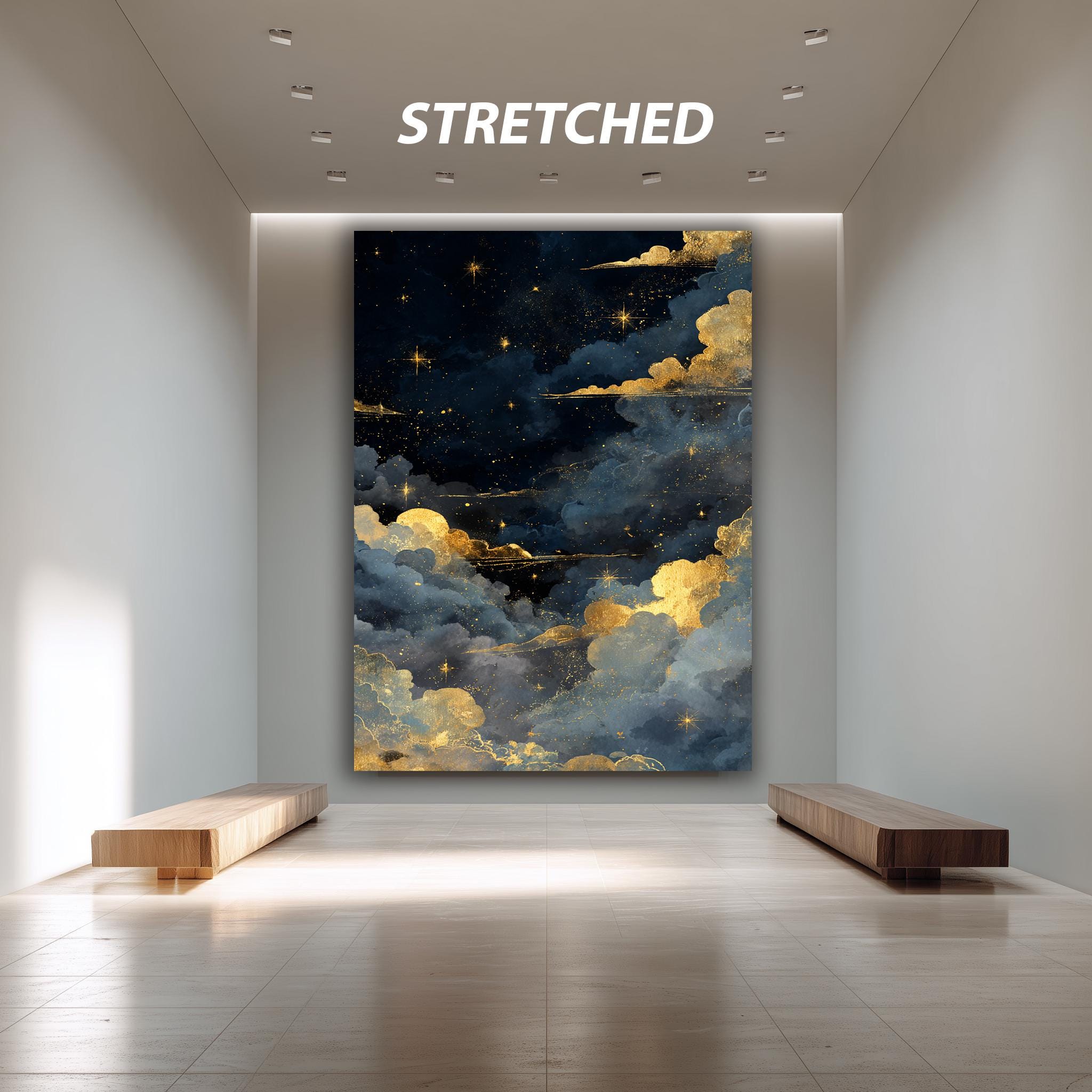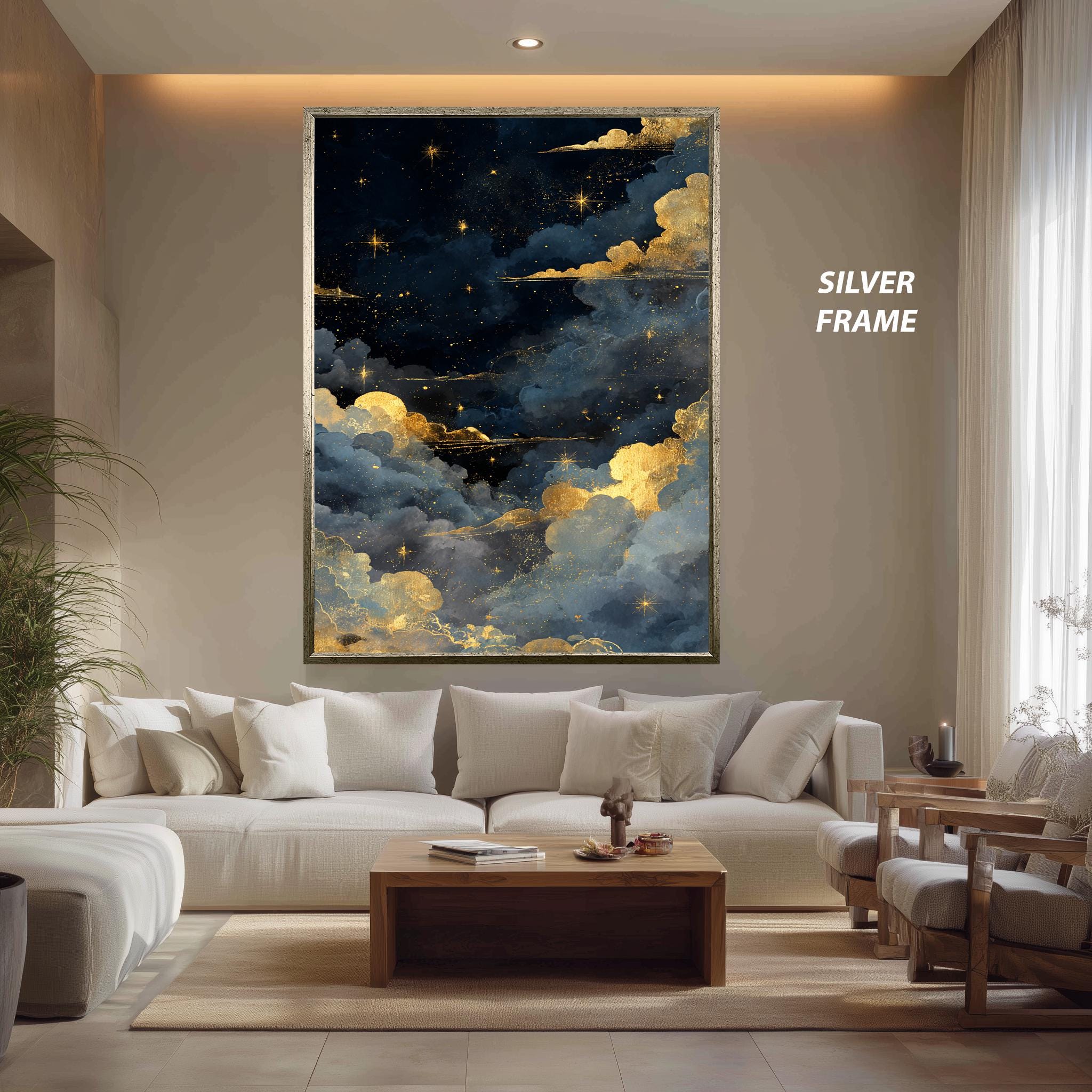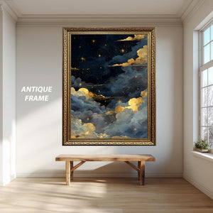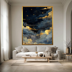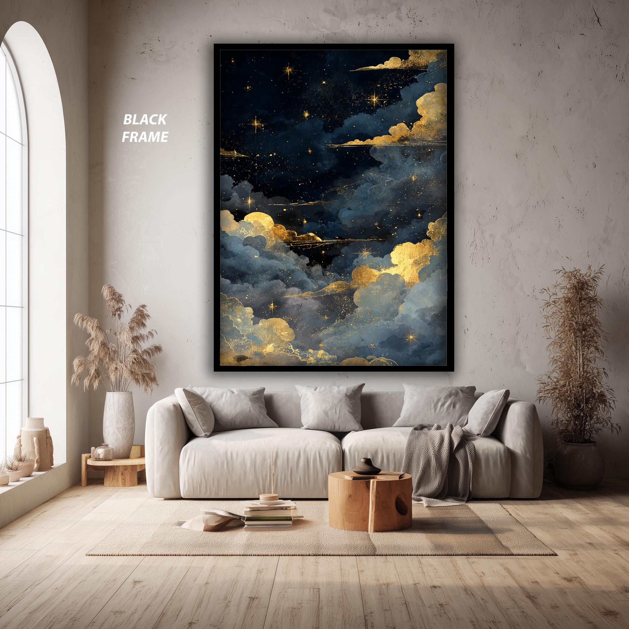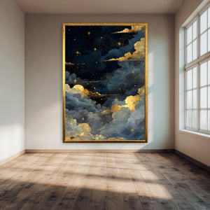 The Celestial Gold Cloud Night Sky Canvas Wall Art is the perfect celestial wall art to transform your bedroom or office with dreamy night decor that inspires calm and wonder. This elegant galaxy dream decor features a mystical blend of gold cloud artwork and starry sky canvas elements, creating a cosmic sky artwork that brings the magic of the golden night sky indoors. Printed on museum-quality canvas, this moon cloud print delivers rich colors and fine details that elevate any space with spiritual sky decor and boho space print vibes.