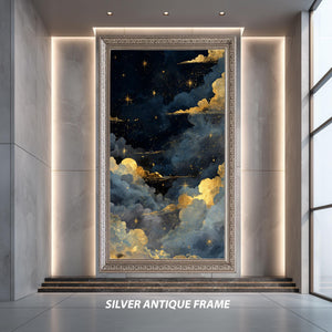This starlight canvas art measures from 8"x12" (20x30cm) up to an impressive 59"x98" (150x250cm), allowing you to choose the perfect size for your wall. Featuring multiple frame options including classic gold, silver, black, white, brown, and luxury aged gold or antique silver frames, this elegant moon wall piece is ready to hang or ship rolled for custom framing. Our advanced printing techniques ensure vibrant colors and long-lasting beauty in every luxury cloud art print.