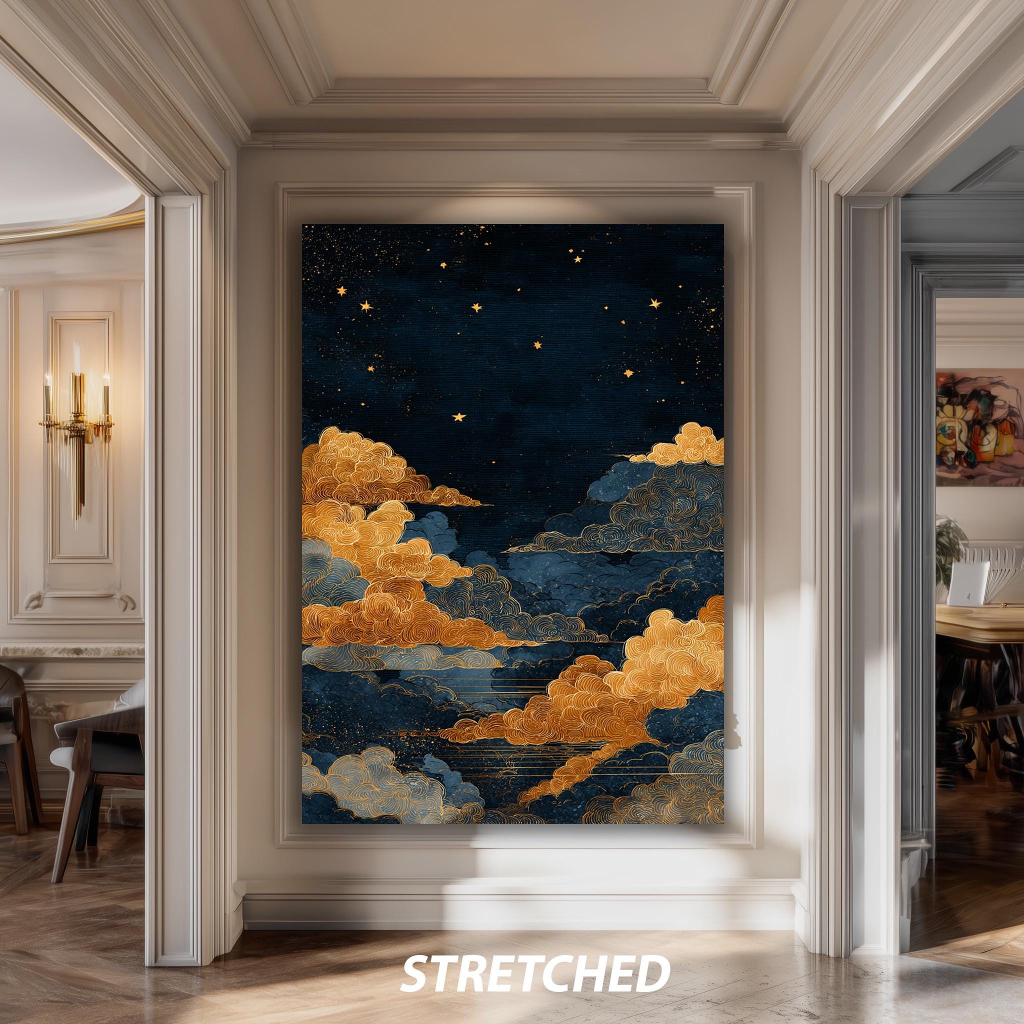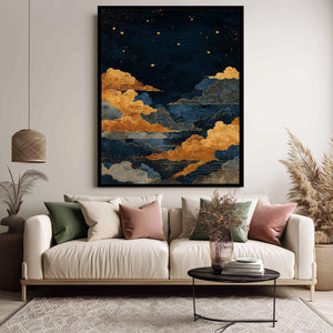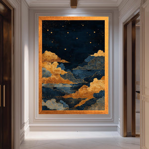 - Celestial wall art with a rich interplay of deep blue and golden cloud print for a dreamy night art effect