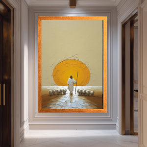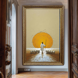 This Jesus Good Shepherd Digital Print Christian wall art offers a striking blend of faith and modern design, perfect for anyone seeking to enrich their space with meaningful religious canvas print. This faith based decor features a spiritual sunset print rendered in empasto style painting, inspired by Mark Rothko's abstract expressionism art, creating a vibrant and contemplative atmosphere. Measuring from 8"x12" (20x30cm) up to 59"x98" (150x250cm), this gallery wrapped canvas is ready to hang and enhances any room with minimalist religious art or contemporary faith art.