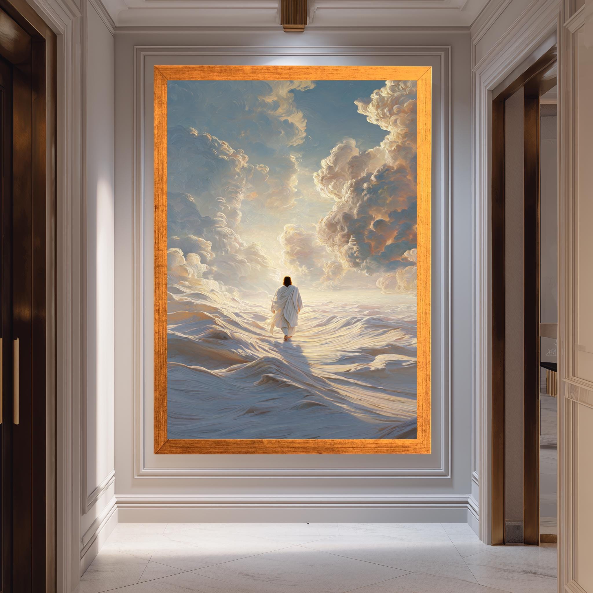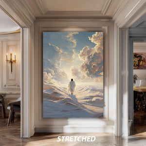 Printed on museum-quality gallery wrapped canvas, this contemporary Christian art piece is designed to last with vivid colors and fine details. Available in multiple sizes ranging from 8"x12" (20x30cm) to 59"x98" (150x250cm), it fits perfectly in living rooms, bedrooms, or offices. Choose from unframed rolls for custom framing or stretched canvas with classic or luxury frame options including gold, silver, black, white, brown, aged gold, antique gold, and antique silver.