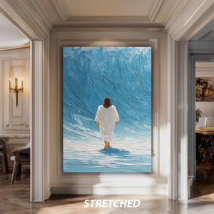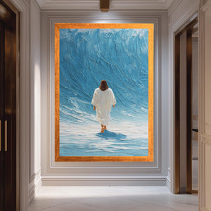 This Jesus Walking on Water Blue Wave Digital Wall Art textured Christian poster is a stunning example of Christian wall art designed to inspire faith and add spiritual depth to your home decor. This abstract faith painting captures the miracle of Jesus walking on water through a rich blue wave canvas and digital religious artwork that brings tranquility and reflection to any space. Measuring from 8"x12" (20x30cm) up to 59"x98" (150x250cm), this blue wave canvas print offers a versatile size range to fit your living room, bedroom, or office with modern Christian decor.