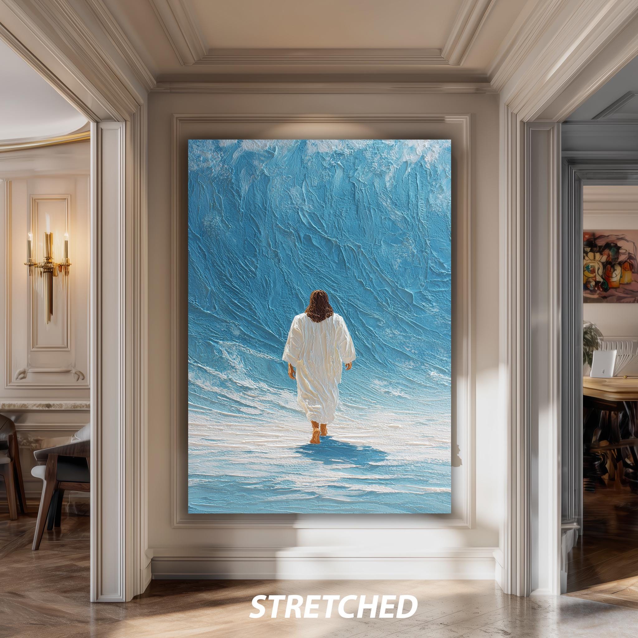 Whether you want to enhance your personal sanctuary or give a meaningful present, this Jesus wave art brings both beauty and faith into your environment. DreamLineCanvas is committed to delivering high-quality digital religious artwork that transforms walls into places of reflection and hope. Choose this textured Christian poster today to elevate your spiritual wall hanging collection with a piece that resonates deeply and looks stunning in any setting.