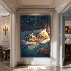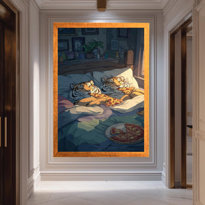 The cozy tiger art print captures a charming and whimsical animal illustration that brings a playful yet comforting vibe to any space. This digital art download features a funny bedtime wall decor scene with a pizza lover art print theme, perfect for adding personality to your bedroom, dorm, or lounge. Designed as a colorful tiger poster, this comfy room artwork combines pastel tiger wall print tones with modern canvas print quality to brighten up your walls and create a warm atmosphere.
