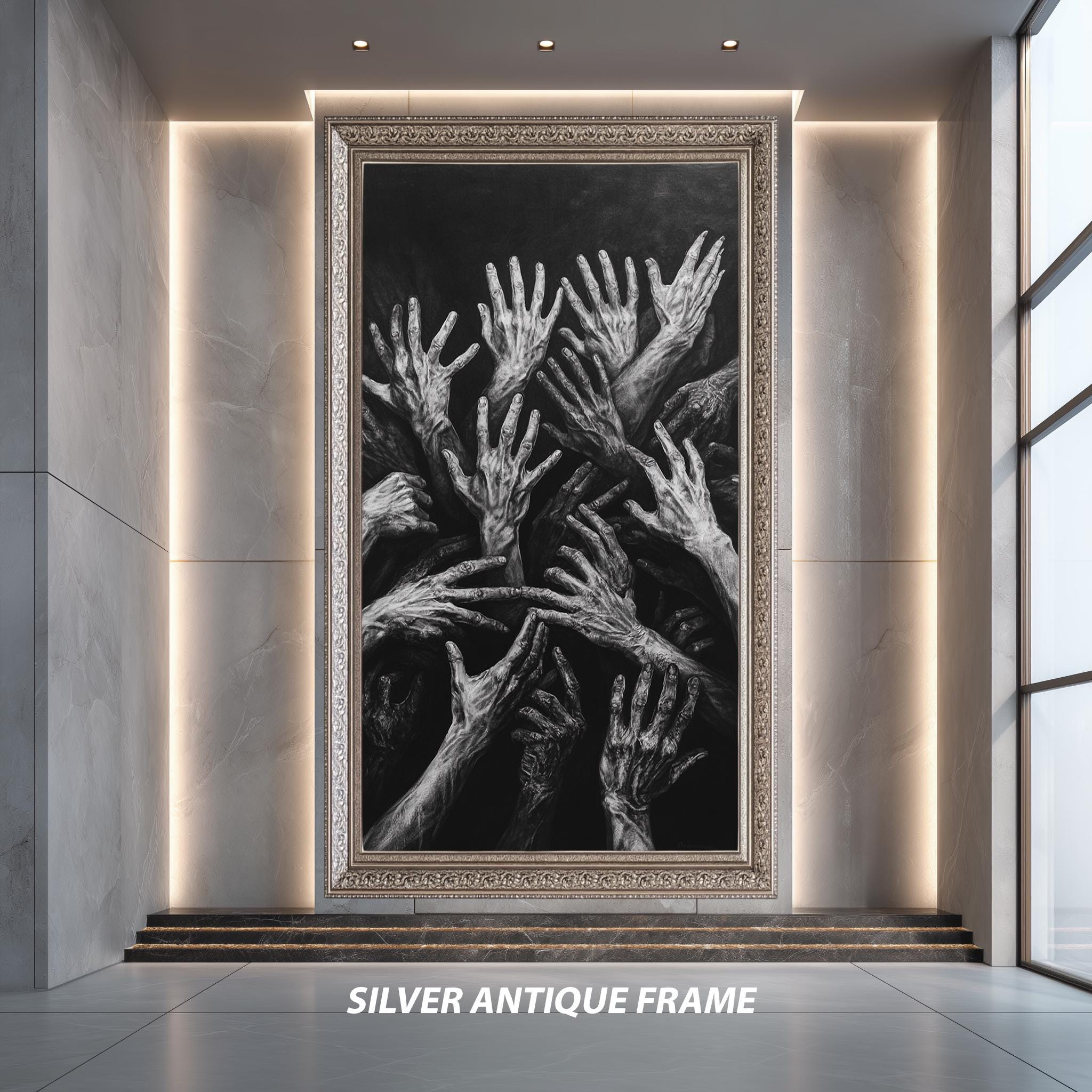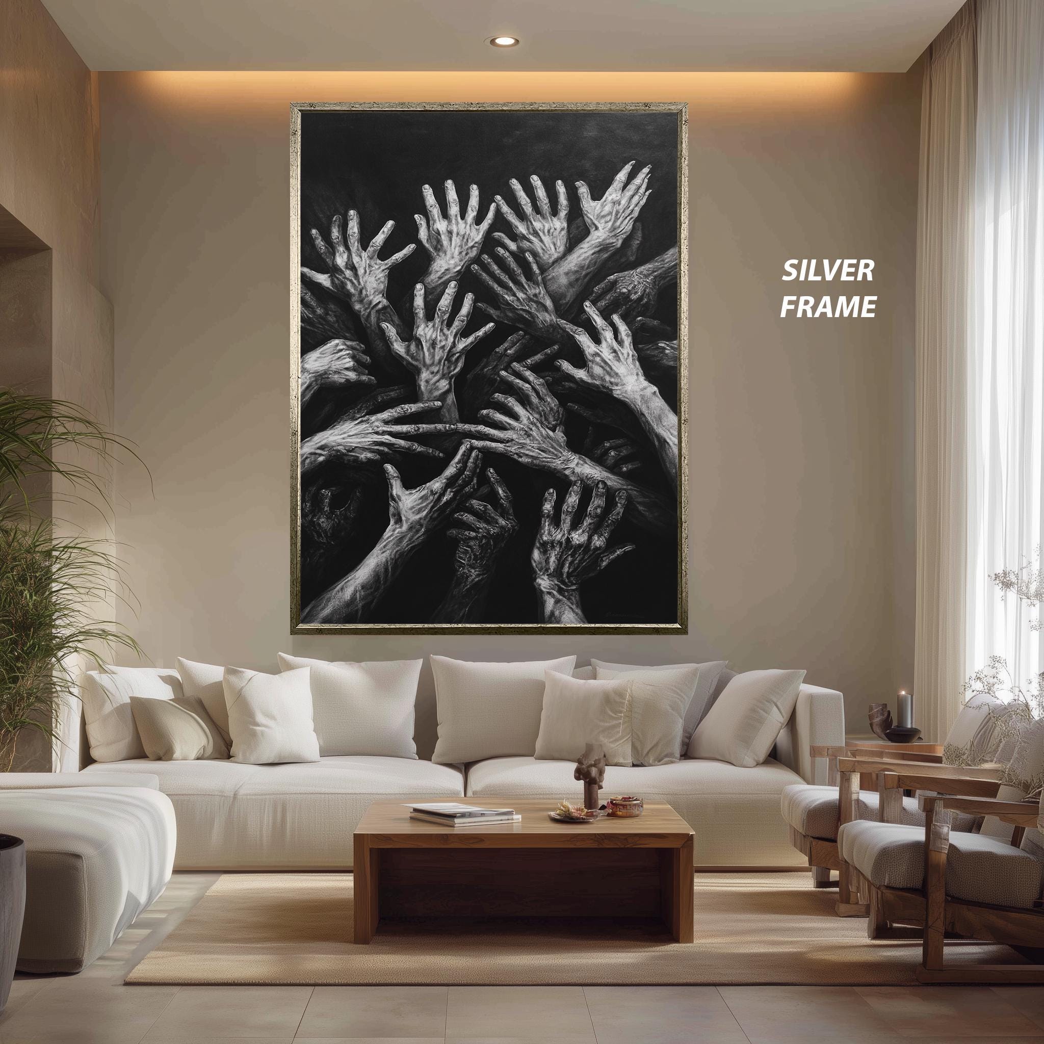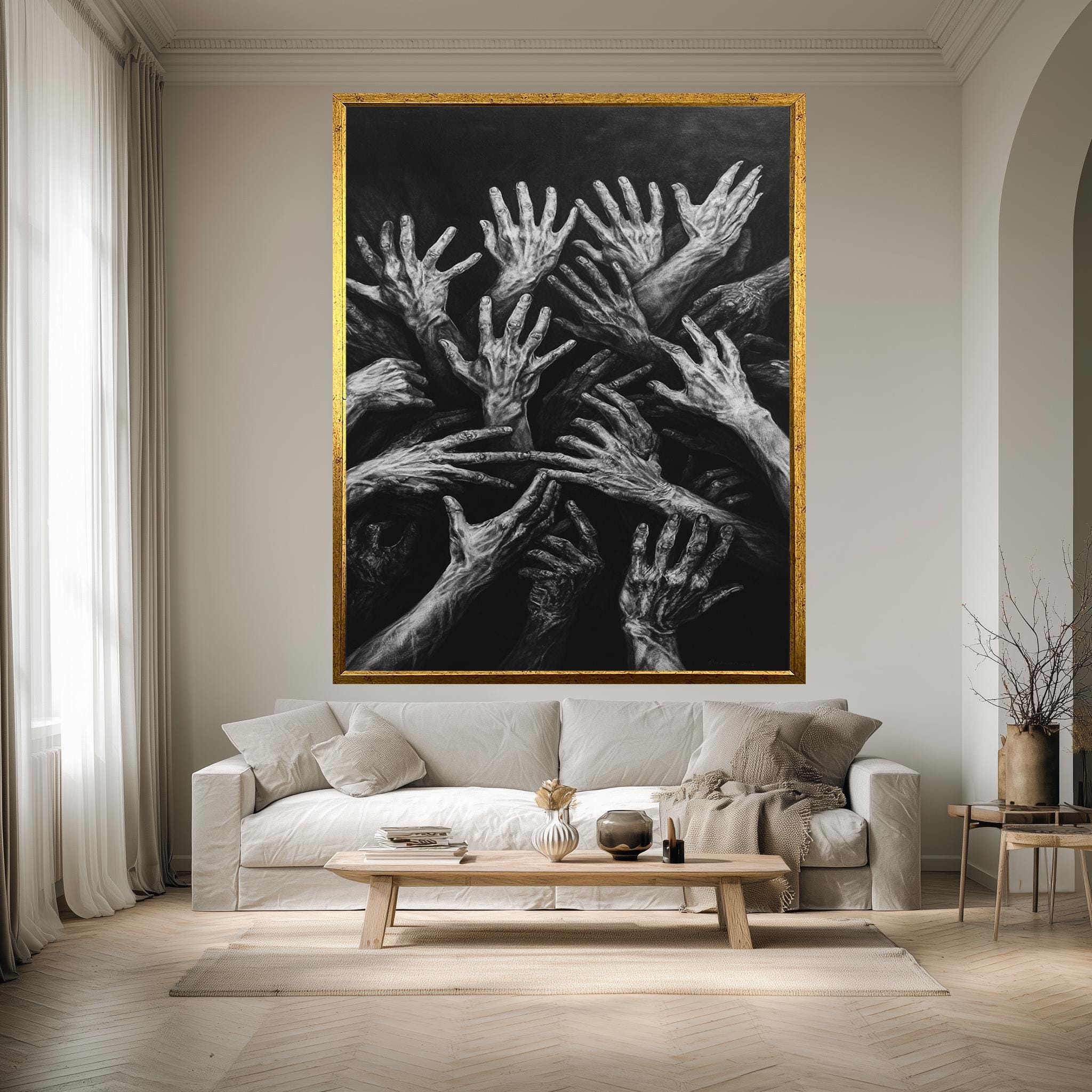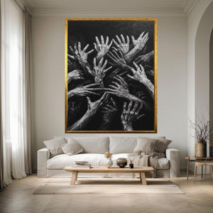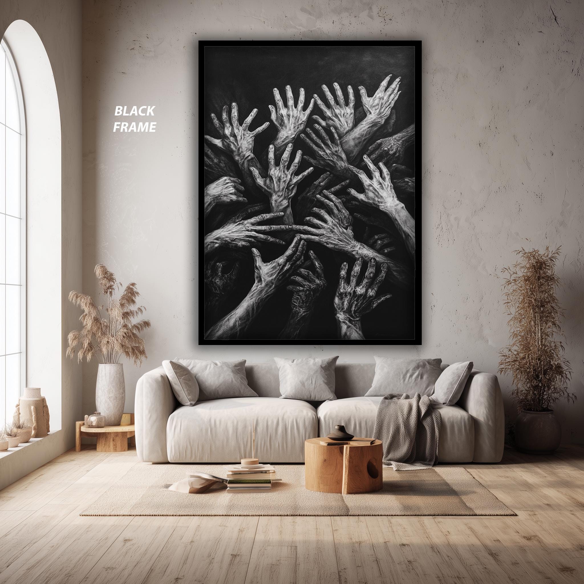 The dark reaching hands canvas is a dramatic surreal poster that brings emotional art decor to any space, perfect for those seeking expressive hand artwork and gothic room poster vibes. This black and white wall art captures the intensity of psychological art pieces through its moody canvas print style, making it an ideal choice for fans of abstract expressionism art. Crafted as a gallery wrapped canvas, this minimalist home decor piece adds a modern wall decoration touch to contemporary art print collections.