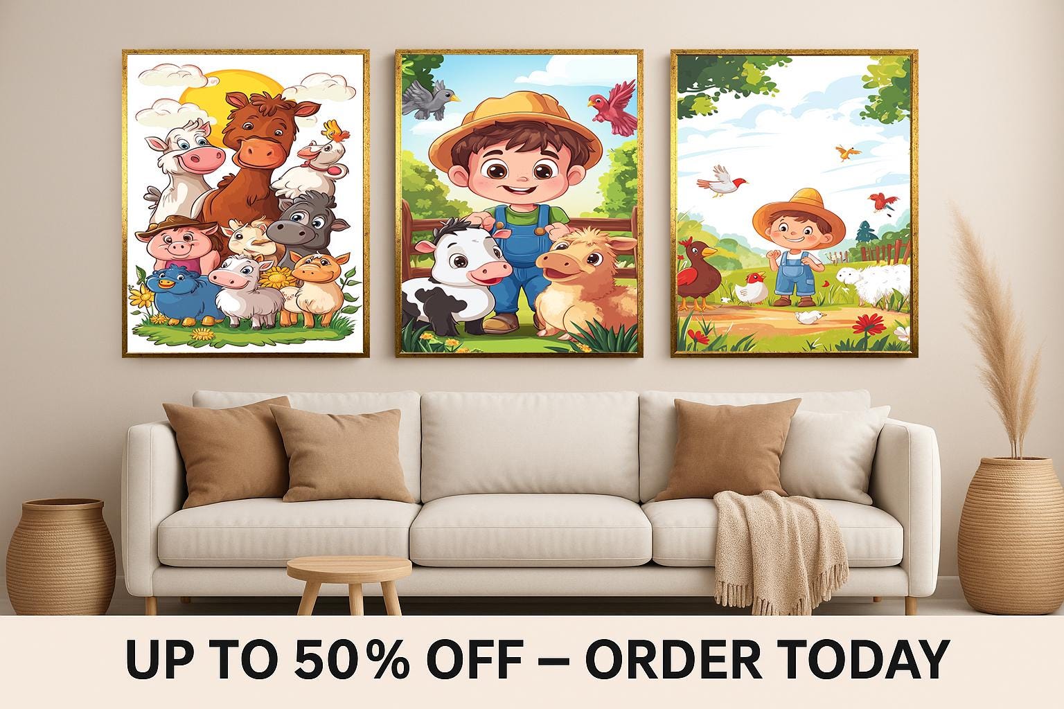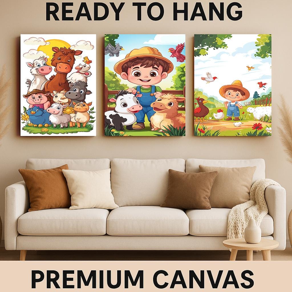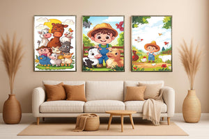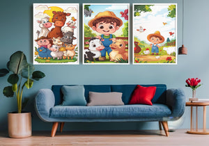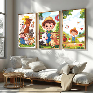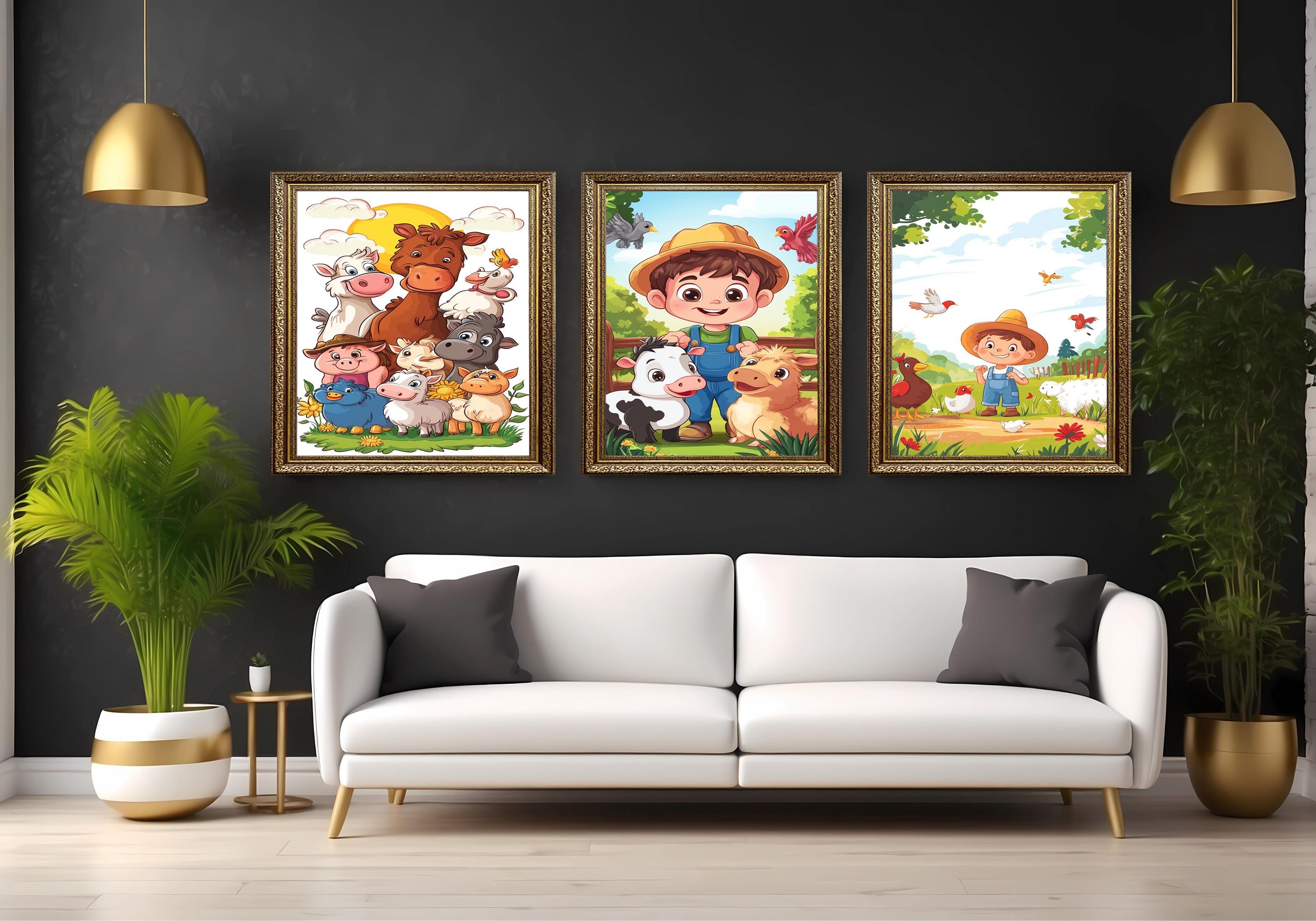 This delightful farm animal nursery art set of 3 prints is designed to brighten any baby room or playroom with colorful kids room art featuring cartoon farm animals. Each print showcases charming, cute animal illustrations alongside a joyful boy farmer, creating a playful and educational nursery room decor that sparks imagination and joy. Perfect for children's farm wall decor, these farm animal wall art pieces bring the farm life nursery theme to life with vivid colors and engaging scenes.