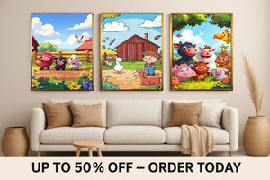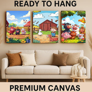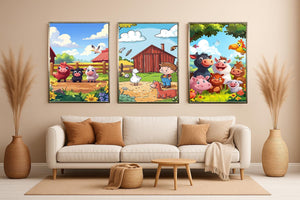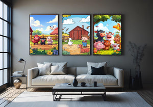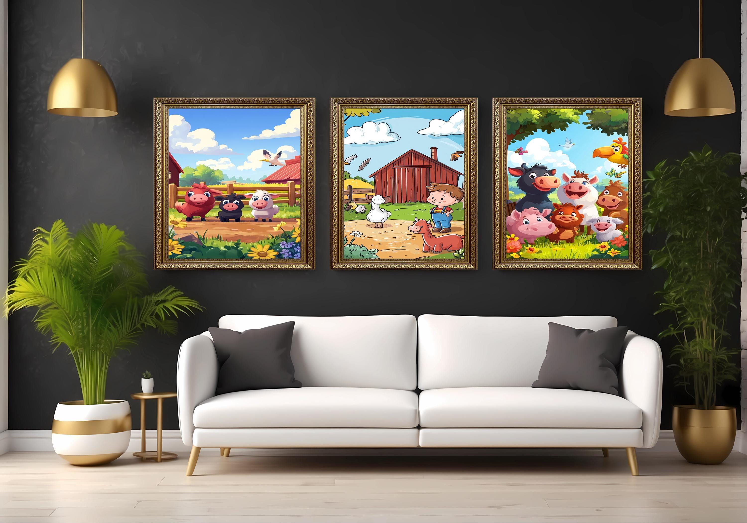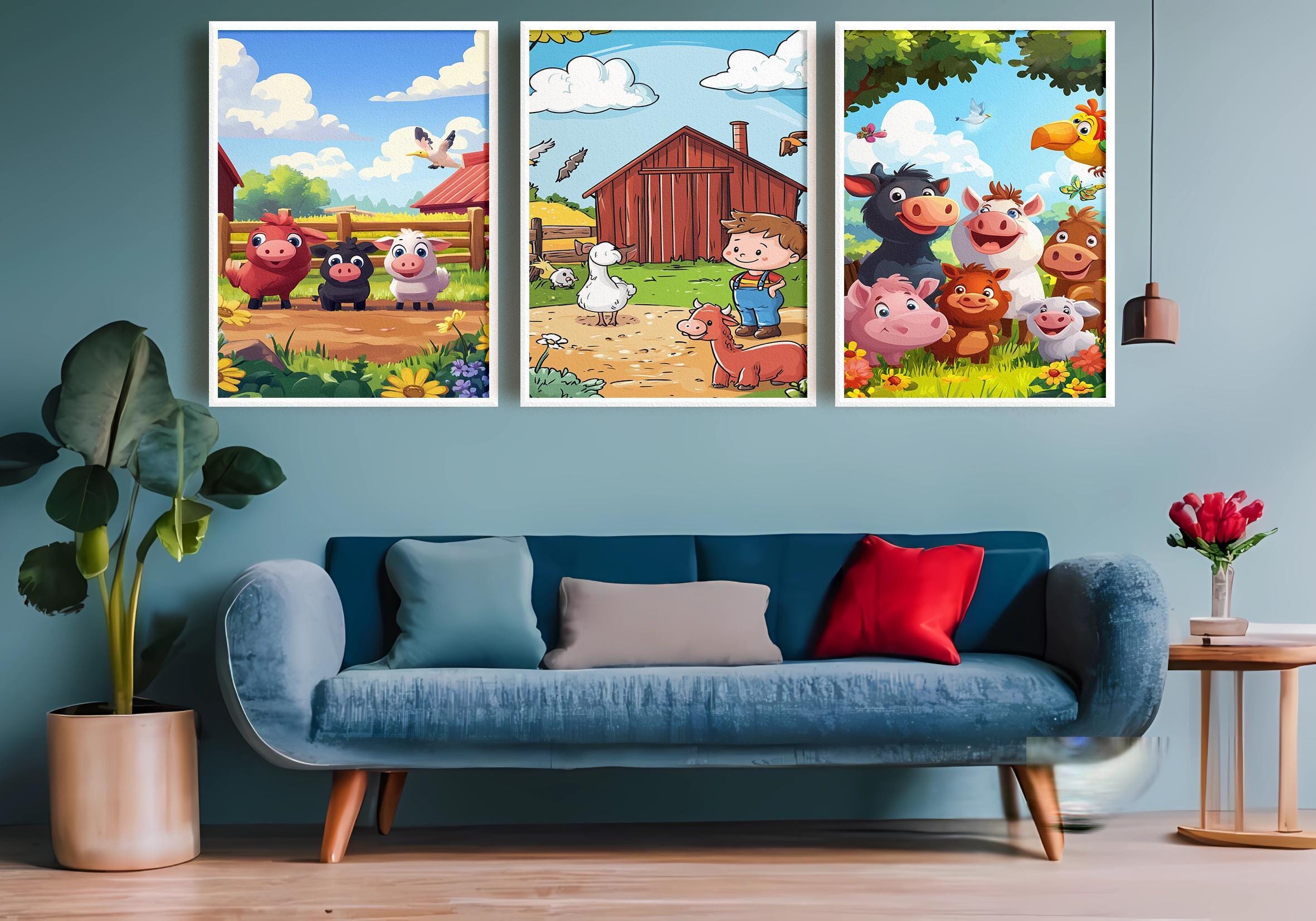 Enhance your child's space with our farm animal nursery prints, designed to bring playful farmhouse artwork into any baby room wall art collection. This whimsical baby room decor features colorful kids prints that create a cozy, inviting atmosphere perfect for nurseries and toddler rooms. Each piece in this 3-print set showcases cartoon farm animals in lively scenes that spark imagination and joy.