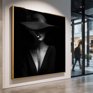 Crafted on high-quality archival paper, this noir woman print measures 16 x 20 inches, delivering sharp details and rich contrast that make the smoking woman art and cross necklace art elements stand out vividly. Its monochrome palette enhances any room with a timeless and sophisticated look.