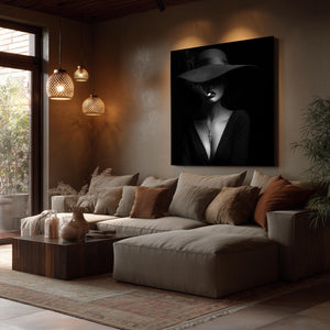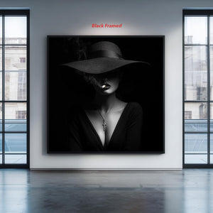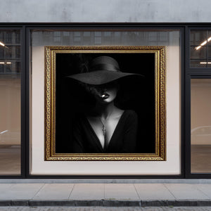 Gothic Art Print – Noir Woman with Hat, Cross Necklace & Moody Elegance