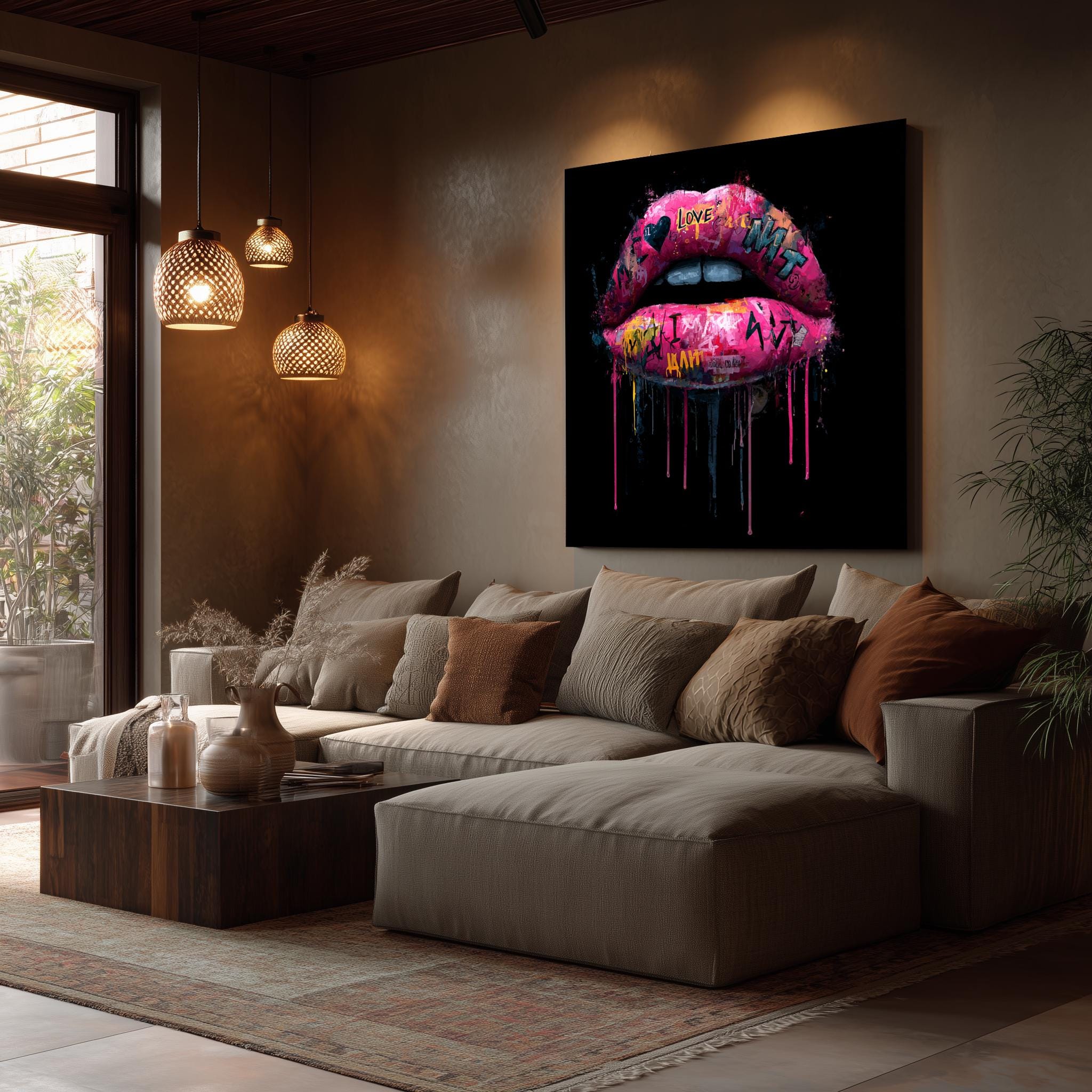 - Vibrant pink lips poster with neon drip artwork → creates an eye-catching focal point