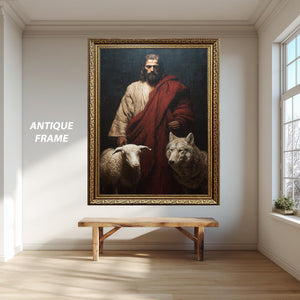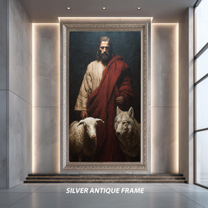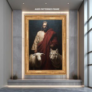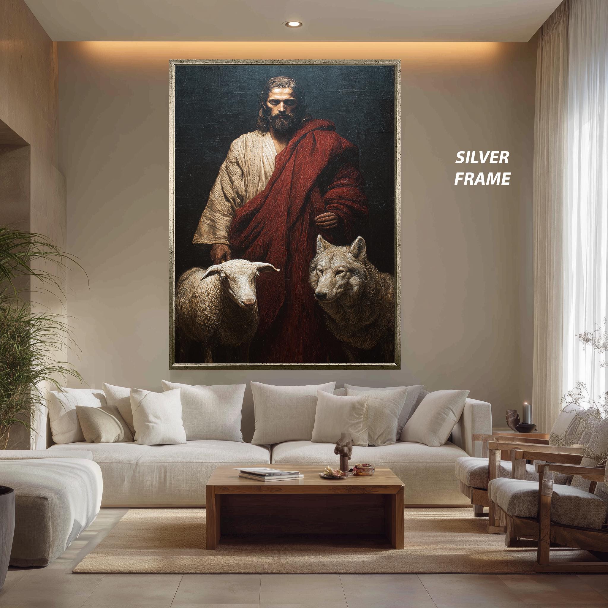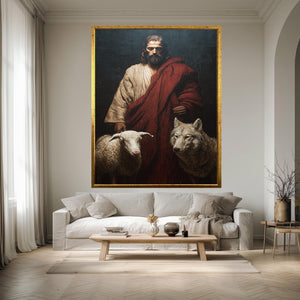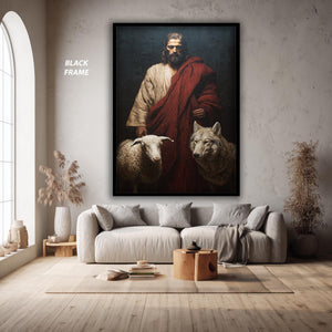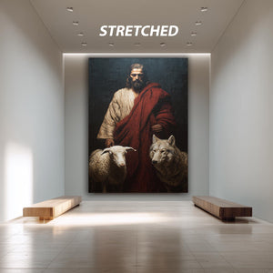 This Jesus Christ canvas art features a powerful portrait of Jesus with a lamb and wolf, designed to inspire faith and reflection in any space. As a religious canvas print, it offers a vivid spiritual faith artwork that brings sacred art for home or church wall decoration. Measuring from 8"x12" (20x30cm) up to 59"x98" (150x250cm), this high-quality canvas wall hanging delivers a striking Jesus portrait painting with deep symbolism and vibrant detail.