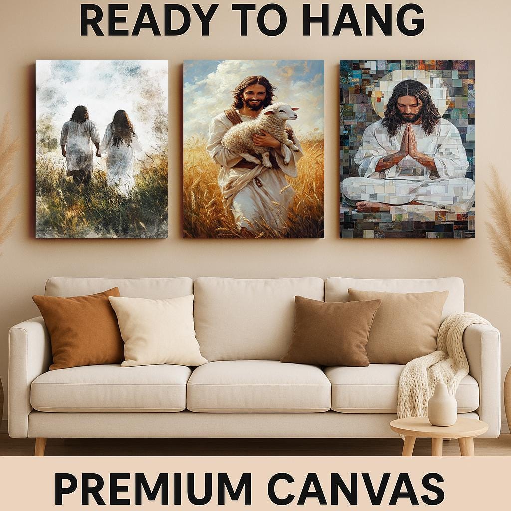 Experience the power of religious canvas prints designed to transform your space with spiritual home decoration. This faith based artwork features three distinct scenes: Jesus holding a lamb symbolizing care, deep in prayer reflecting devotion, and walking in fellowship demonstrating guidance. Printed on premium 100% natural cotton canvas using eco-friendly inks, these prints resist fading and maintain vividness for years.