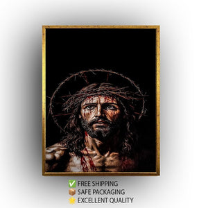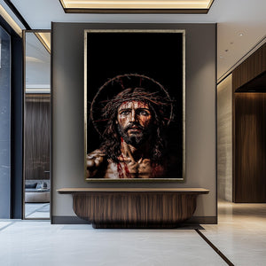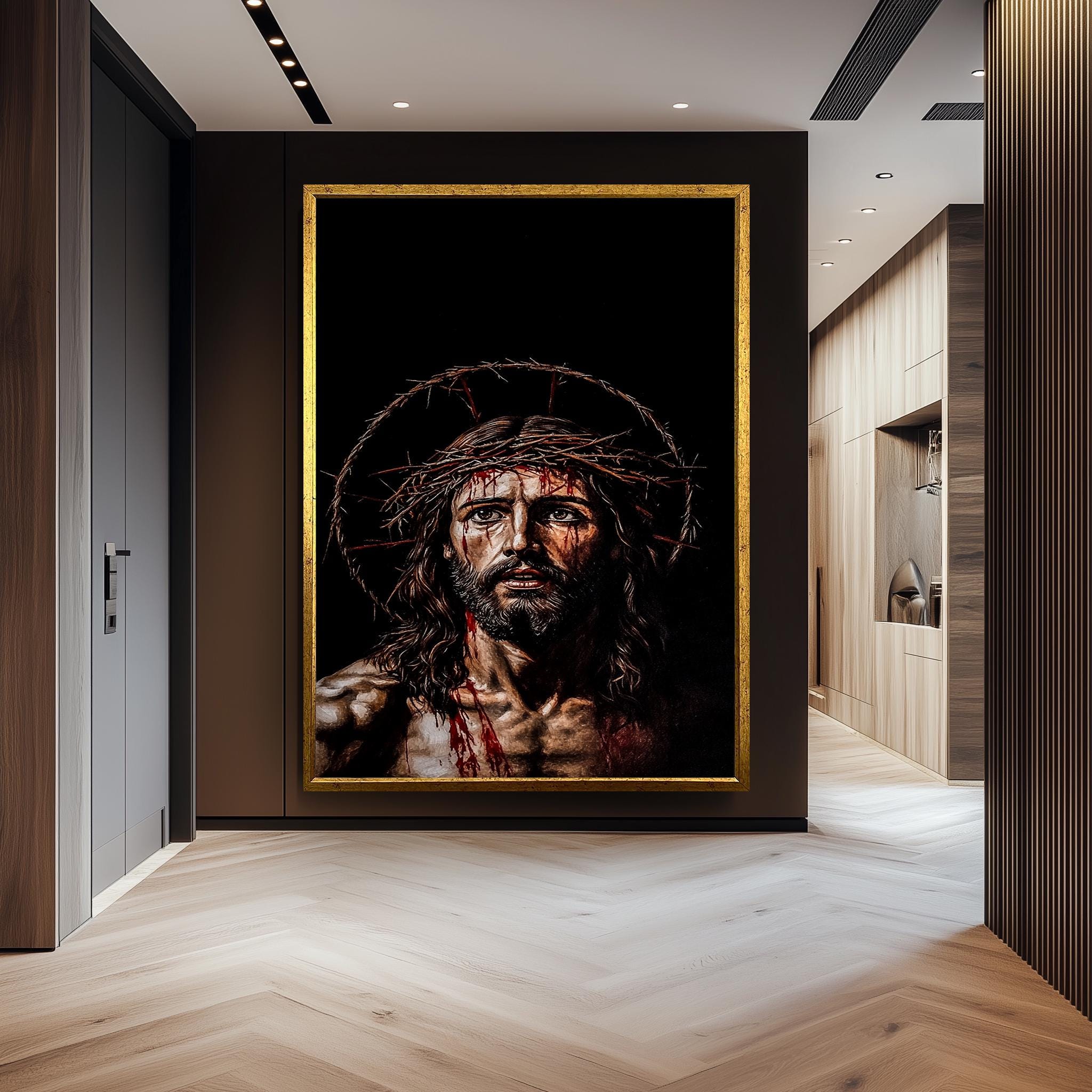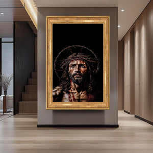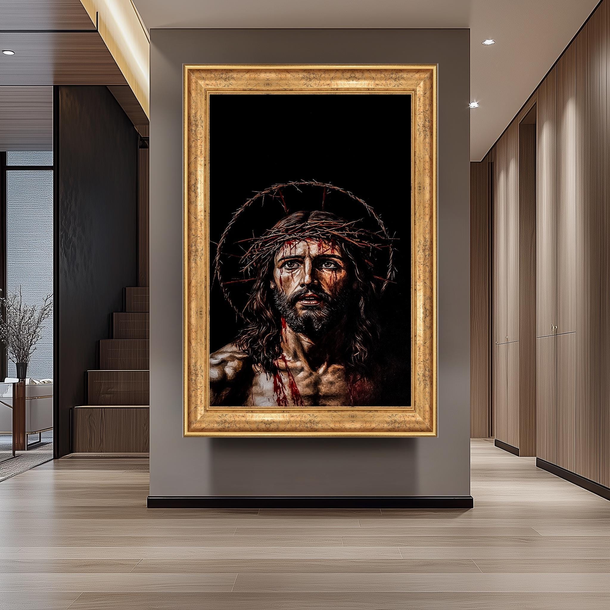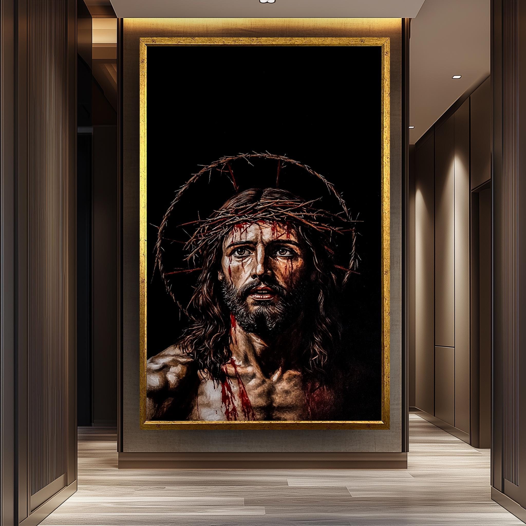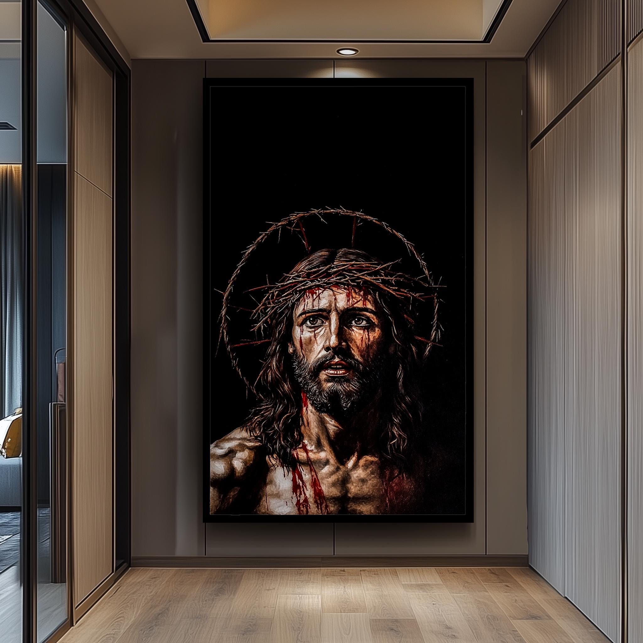 The Jesus Crown of Thorns Wall Art is a powerful religious canvas print that vividly captures Christ's suffering painting with a dark background Jesus art, designed to inspire faith and reflection in any spiritual home art setting. This striking Christian wall decor portrays the intense moment of Christ’s sacrifice painting, emphasizing the crown of thorns as a symbol of love, redemption, and divine strength. Perfect for Catholic prayer room art or any faith-inspired artwork collection, it brings a profound spiritual atmosphere to your space.