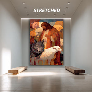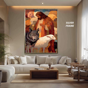 This Jesus digital art print captures the profound symbolism of faith through a stunning Christian mosaic style, making it a perfect addition to any spiritual home artwork collection. Featuring Jesus with wolf lamb imagery, this faith based canvas blends traditional religious themes with modern abstract expressionism art to inspire and uplift your living space. Printed in Mark Rothko style print, the color field painting technique uses deep blues and vibrant reds to evoke contemplation and devotion.