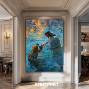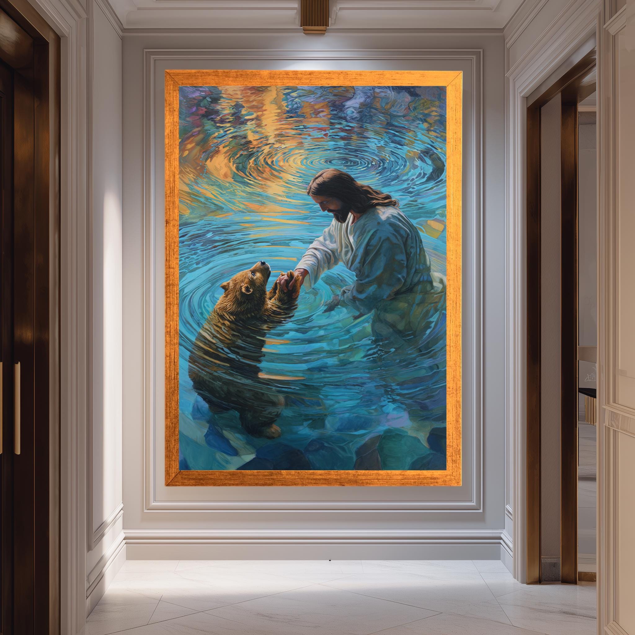 Experience the unique charm of the Jesus Helping Bear art, a digital Christian print that beautifully combines whimsical bible art with a spiritual wildlife scene to inspire faith and nature lovers alike. This nature inspired wall decor features a peaceful Jesus artwork interacting with a gentle bear, symbolizing animal love painting and divine protection. Perfect for those seeking contemporary spiritual decor, this abstract faith canvas captures both modern religious art and minimalist faith artwork aesthetics.
