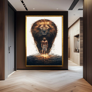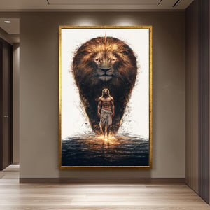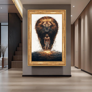 - Symbolic lion and Jesus painting representing courage, protection, and faith