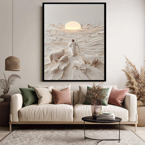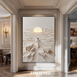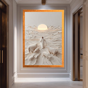 Experience the calming presence of Jesus the Shepherd art with this peaceful Christian illustration featuring lambs and a radiant sunset. This minimalist spiritual home decor print brings divine guidance decor into your living space, creating a serene atmosphere that inspires faith and reflection. Printed on museum-quality canvas, this modern spiritual canvas offers a lasting reminder of hope and protection.