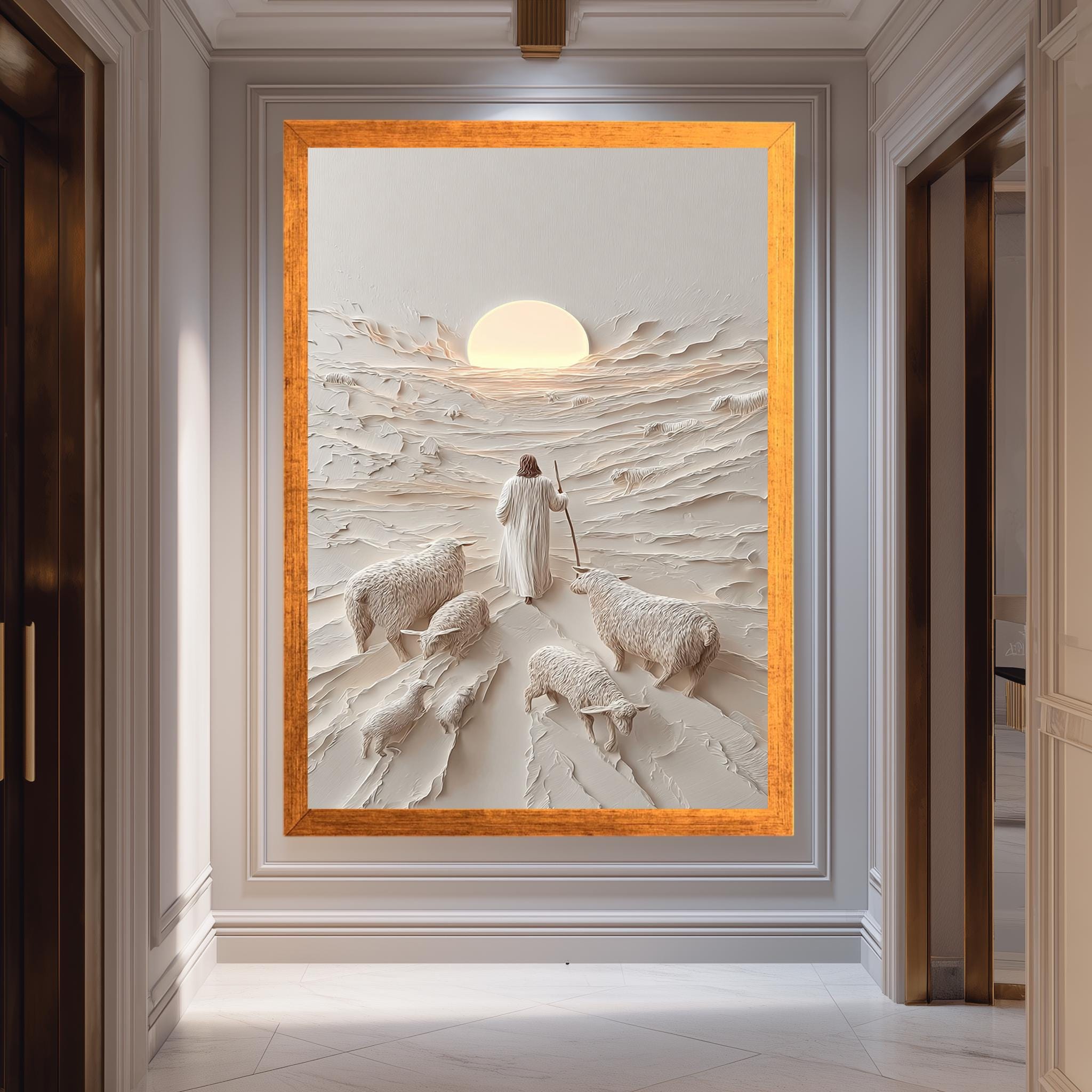 This good shepherd painting measures from 8"x12" (20x30cm) up to 59"x98" (150x250cm), allowing you to choose the perfect size for your room. Featuring vibrant colors and fine details, the lamb of God poster is available as a stretched gallery-wrapped canvas or an unframed roll for custom framing. Frame options include classic tones like gold, silver, black, white, and brown, as well as luxury finishes such as aged gold and antique silver.