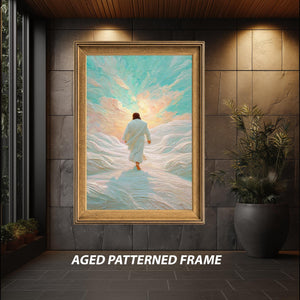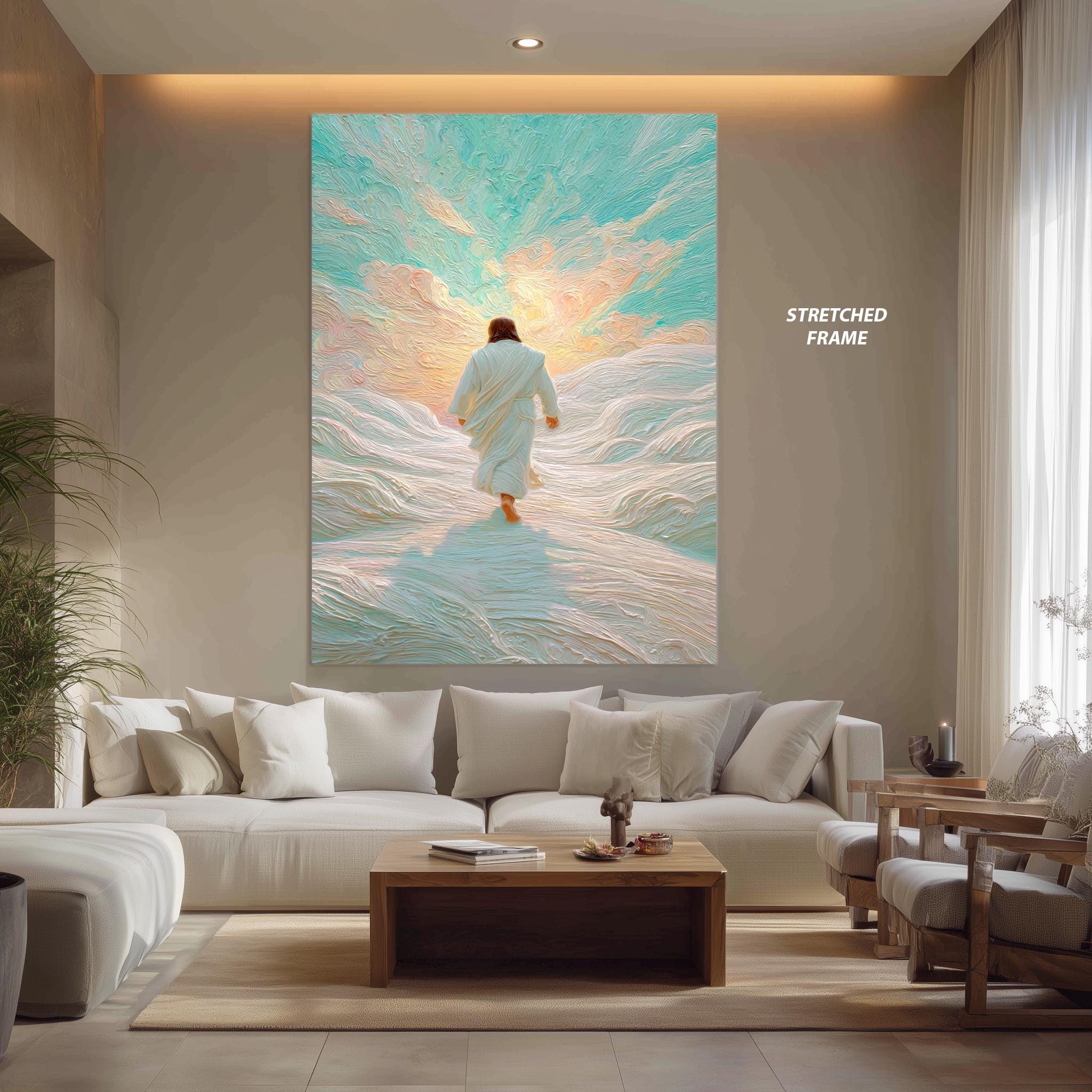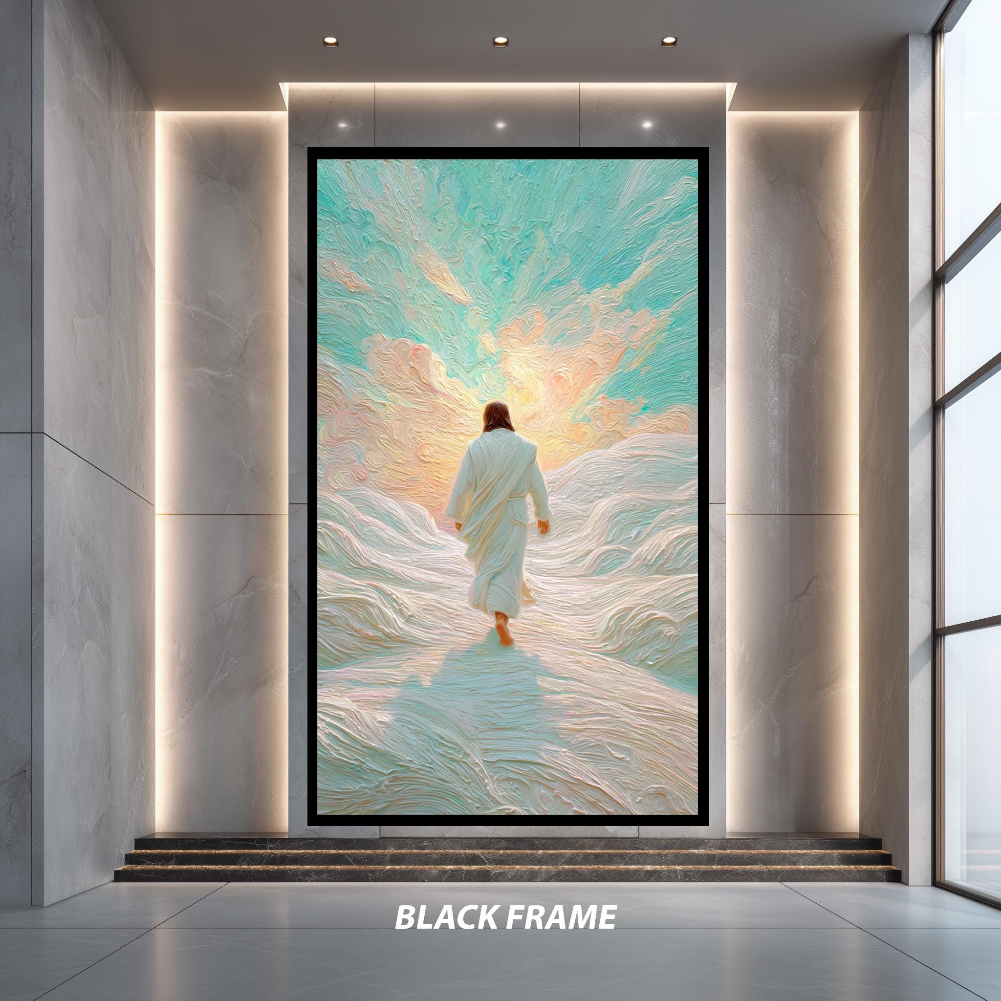 The Jesus Walking Into Light Digital Wall Art is a stunning piece designed to inspire faith and bring divine peace into your space. This Jesus walking light art captures a sacred walk image of Jesus stepping into a colorful heaven decor, symbolizing hope and spiritual renewal. Perfect for prayer room decoration, this religious digital print measures 24 by 36 inches on high-quality holy light canvas, ensuring vibrant colors and lasting durability. Featuring pastel heaven scene tones, this Christian wall art transforms any room with its faith inspired artwork that uplifts and comforts.