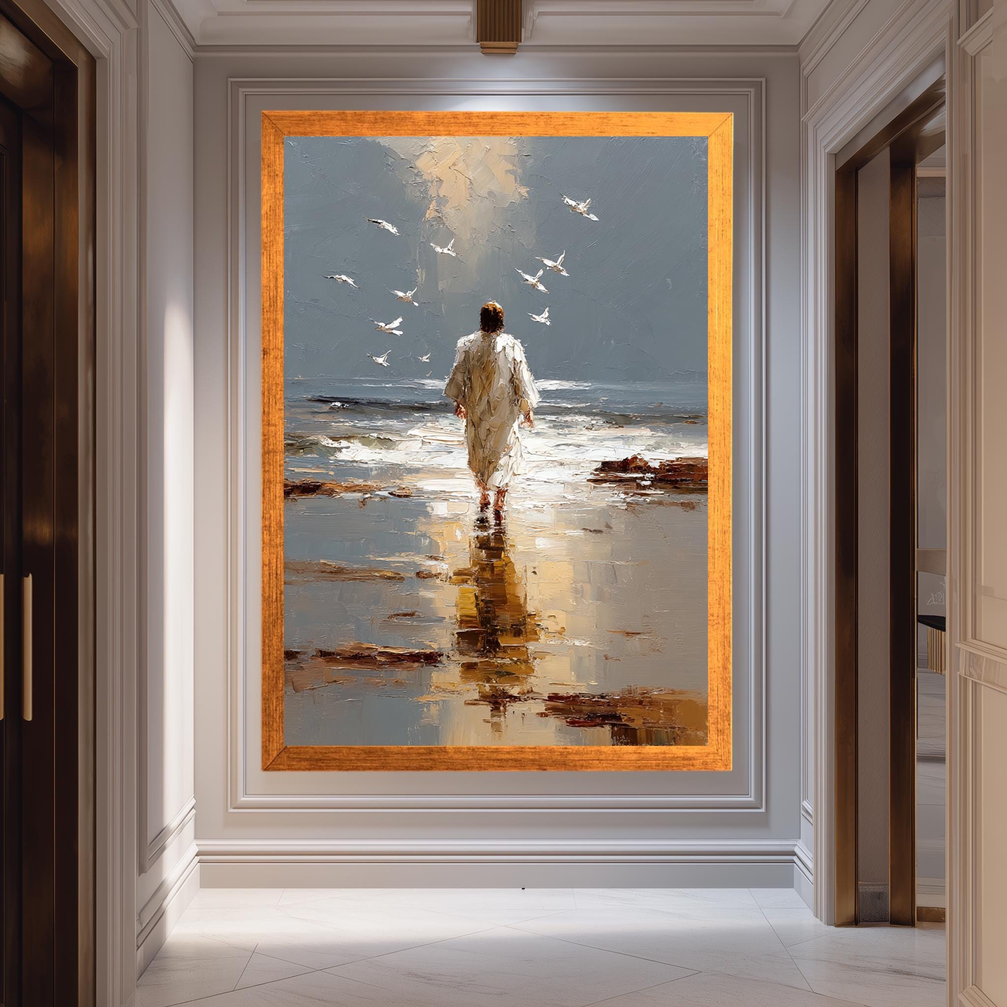The Jesus Walking on Water Art digital print offers a powerful depiction of faith and divine miracle, perfect for enhancing any space with inspirational Christian wall decor. This faith based poster captures the essence of the Bible miracle artwork, featuring a striking blend of deep blues and vibrant reds that symbolize the water faith decoration and spiritual journey of walking on water. Printed on premium canvas, this religious canvas print delivers vivid colors and fine details that bring the Holy Spirit wall art to life, making it an ideal Christian gift idea for believers and art collectors alike.