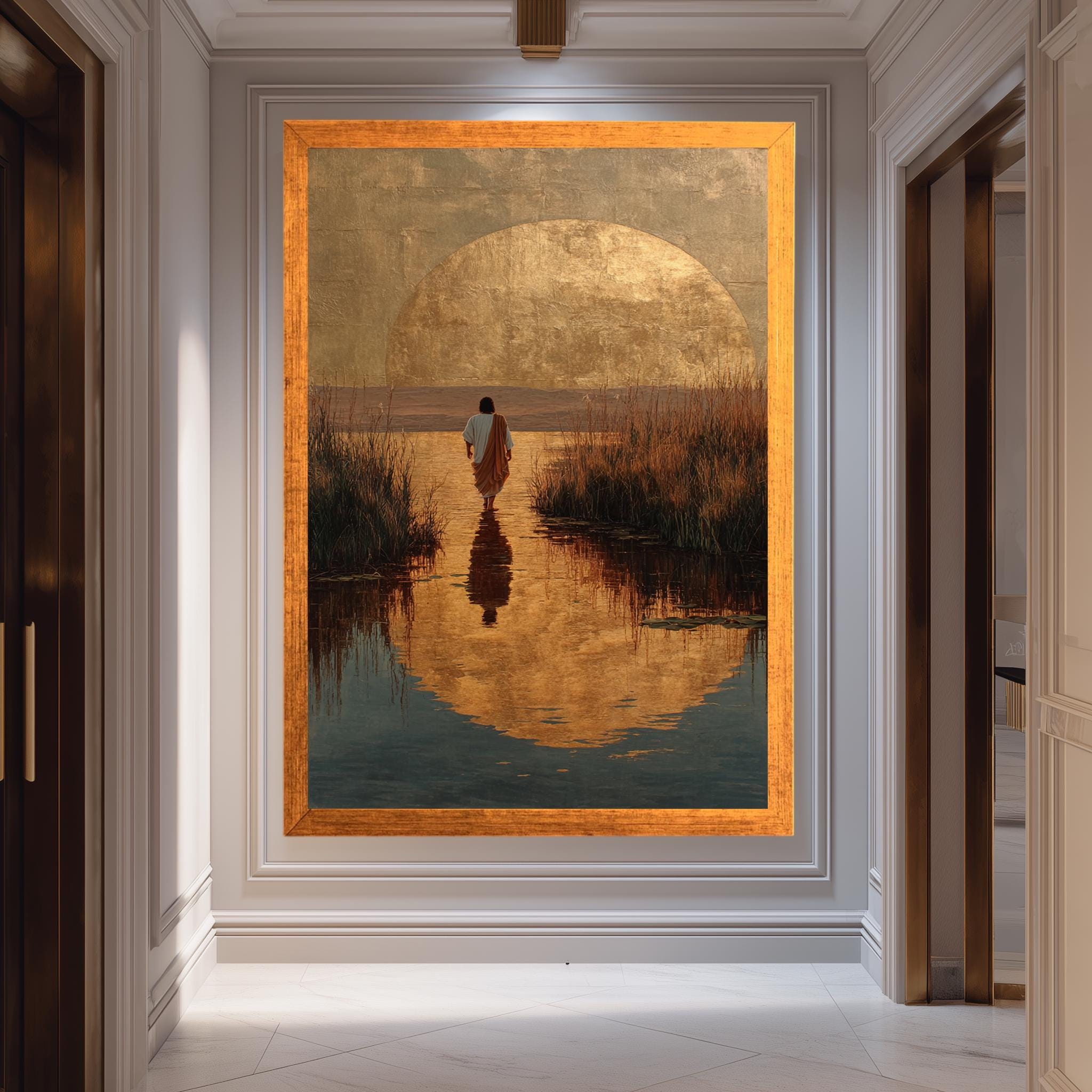 Experience the inspiring presence of Jesus walking on water art with this stunning digital wall art Christian sunset poster. Designed to bring peace and faith into your space, this golden spiritual faith based printable religious artwork captures a serene Bible scene print that enhances any home or office with calming holy artwork. Perfect for those seeking modern Christian decor, this piece combines abstract religious canvas style with minimalist spiritual print elements to create a contemporary faith art statement.