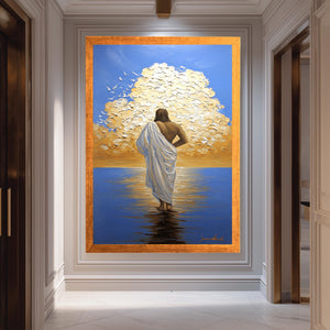 Crafted to suit minimalist faith artwork lovers, this sophisticated religious print combines deep blues and subtle contrasts to evoke calmness and reverence. Measuring from 8"x12" (20x30cm) up to 59"x98" (150x250cm), it fits perfectly into any room while maintaining a sleek, modern aesthetic. Choose from multiple frame options including classic gold, silver, black, white, or brown, as well as luxury aged gold and antique silver frames to complement your décor style.