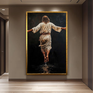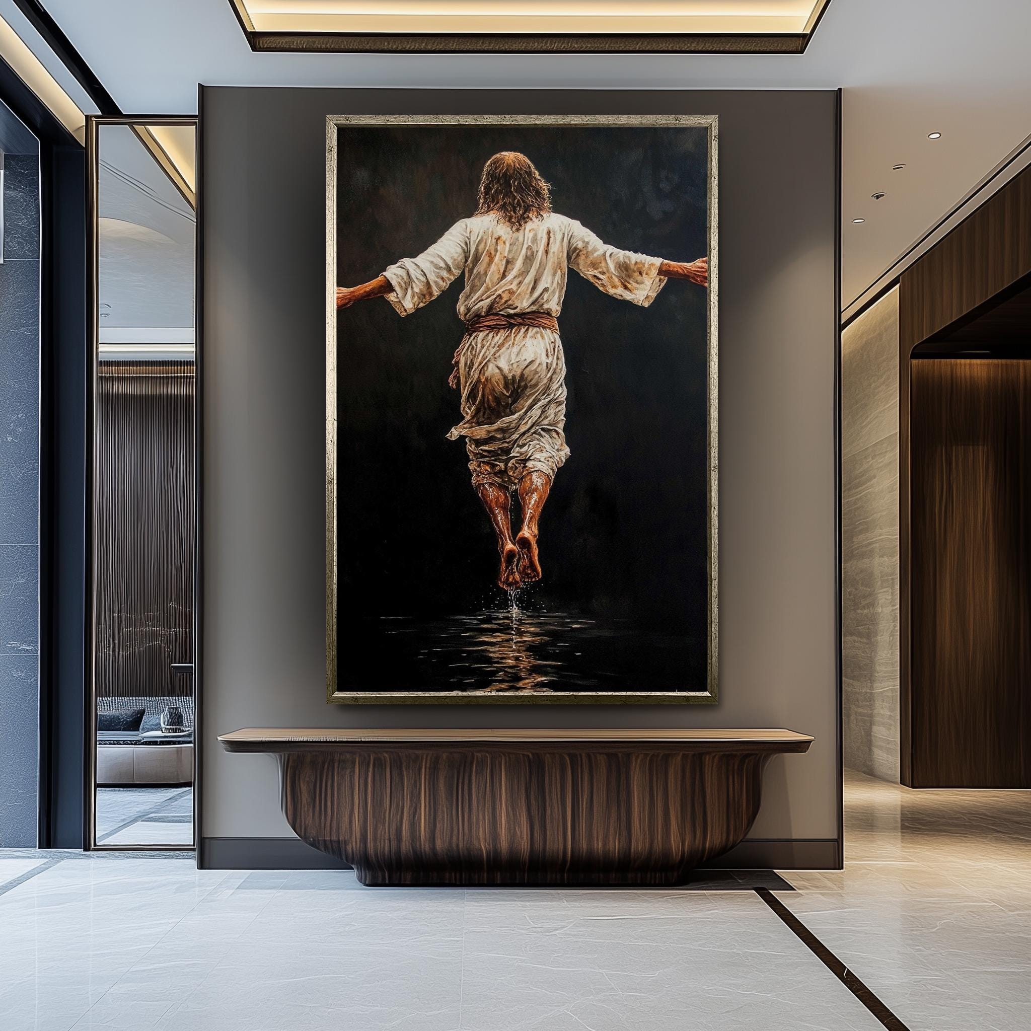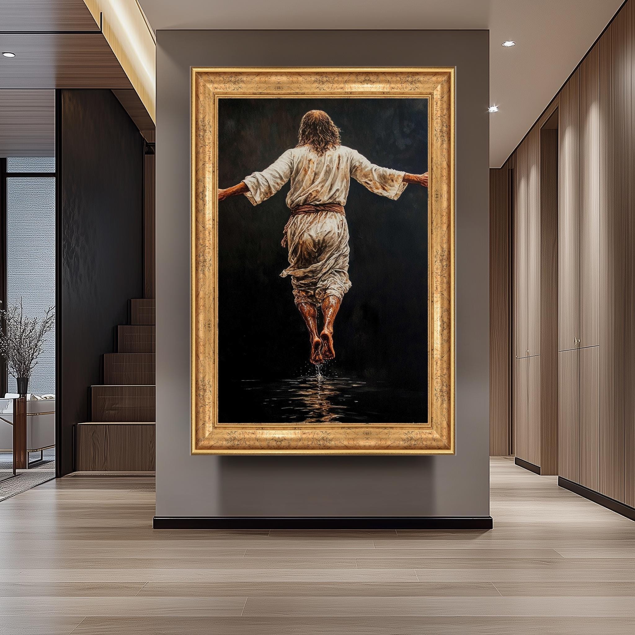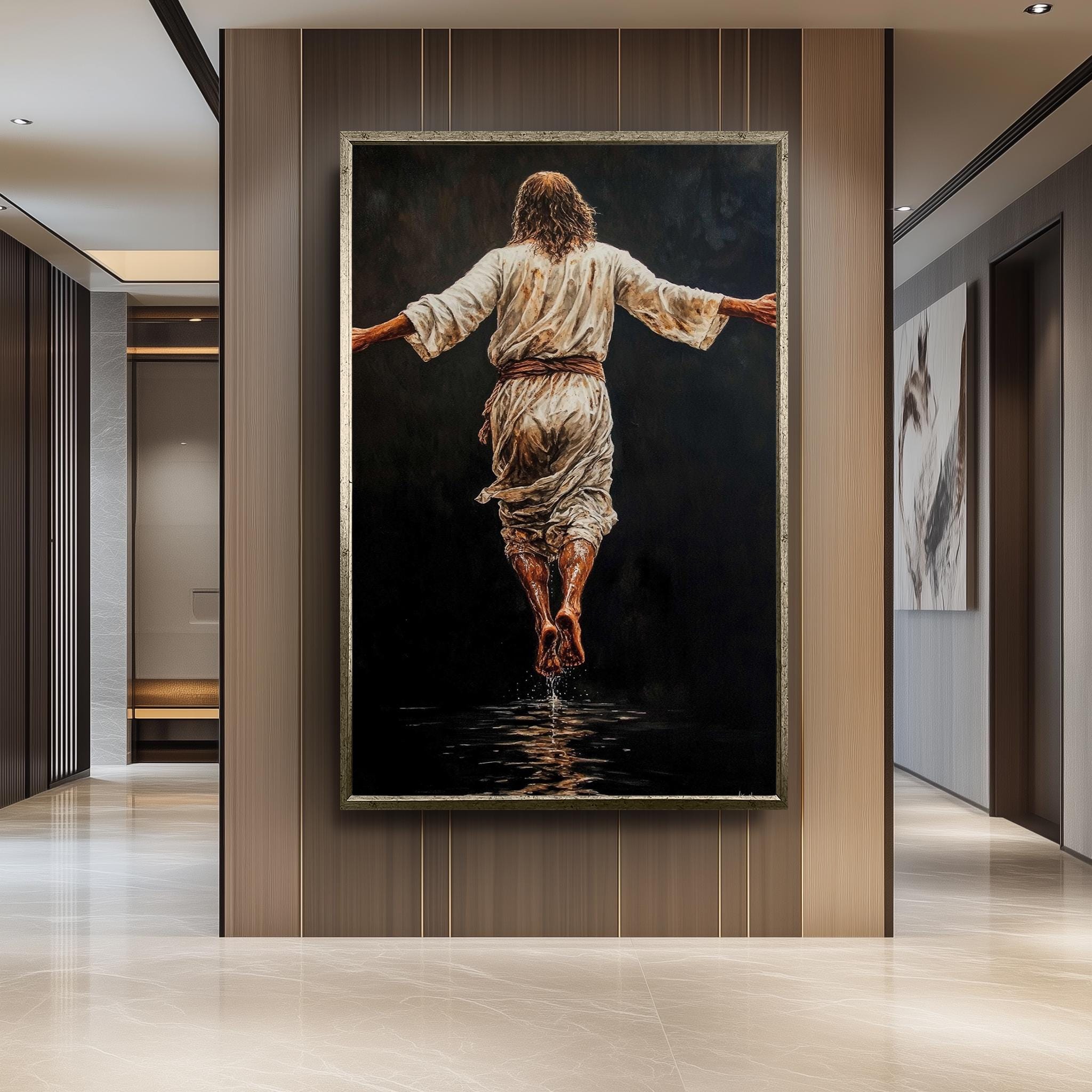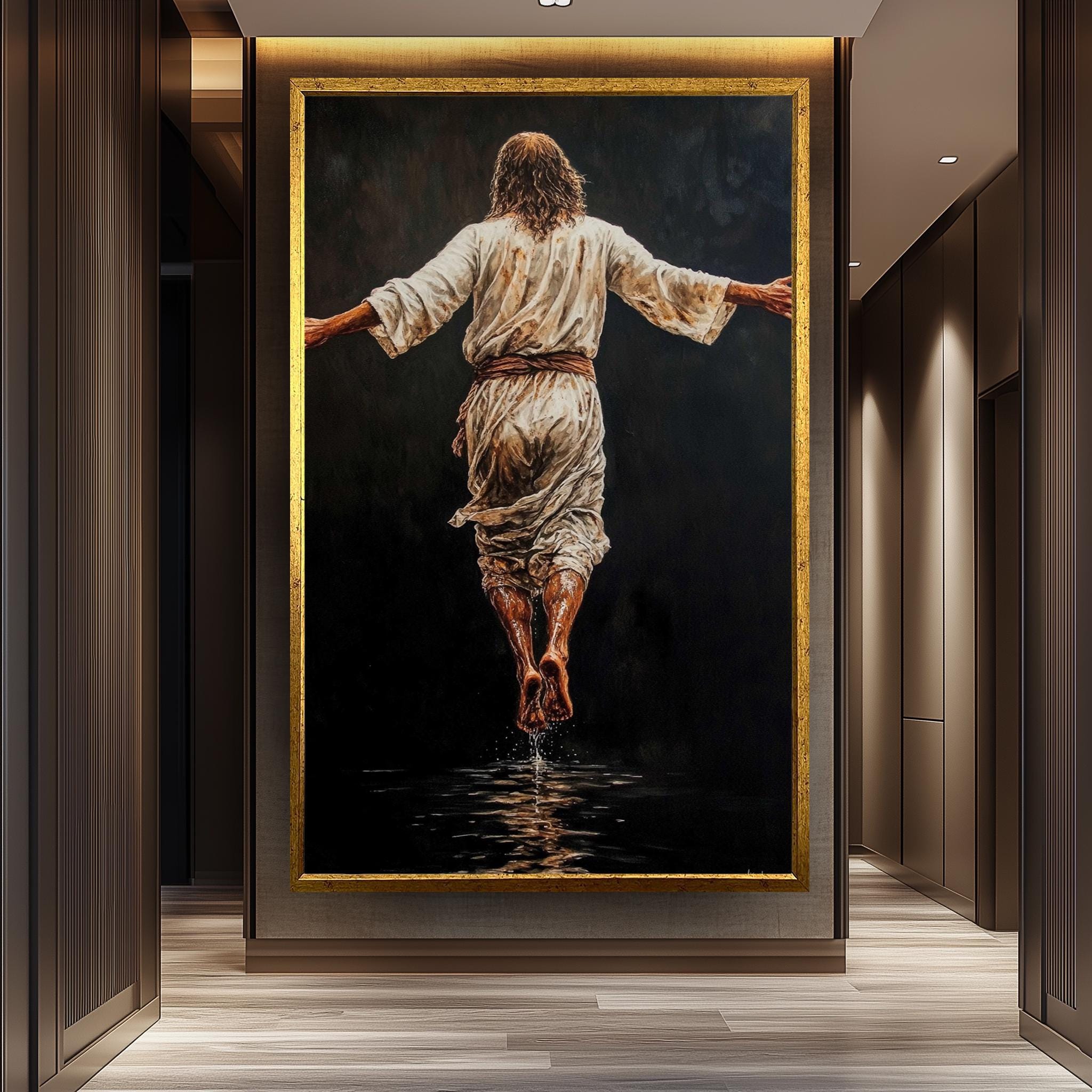 This Jesus walking on water canvas print vividly captures the miraculous moment of faith and divine power, making it an exceptional piece of Christian wall art. Featuring Jesus on water canvas with uplifted arms, this dark spiritual artwork symbolizes resurrection and unwavering belief, perfect for inspiring any space. Printed on premium canvas, this religious home decoration brings a biblical scene painting to life with rich textures and contrast.