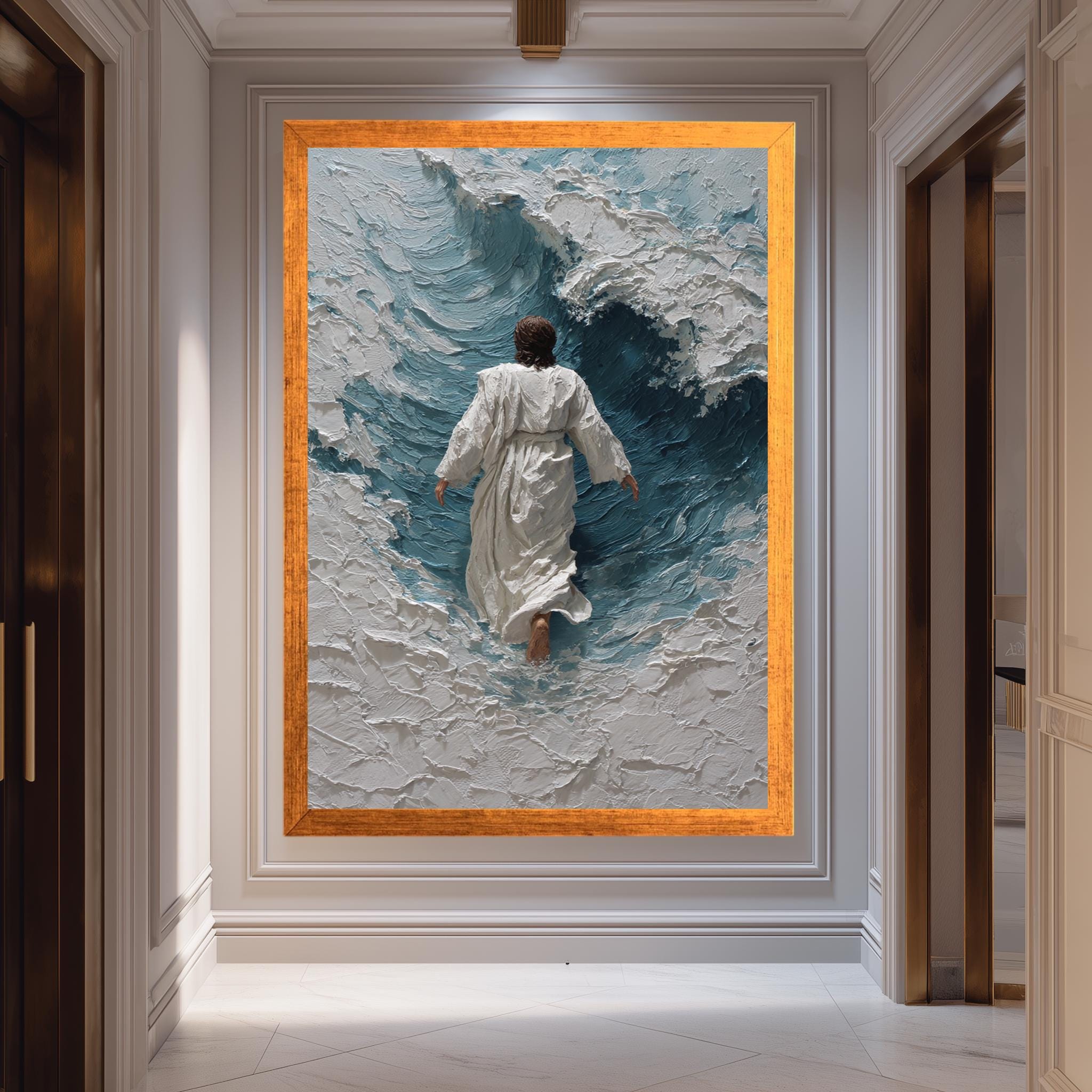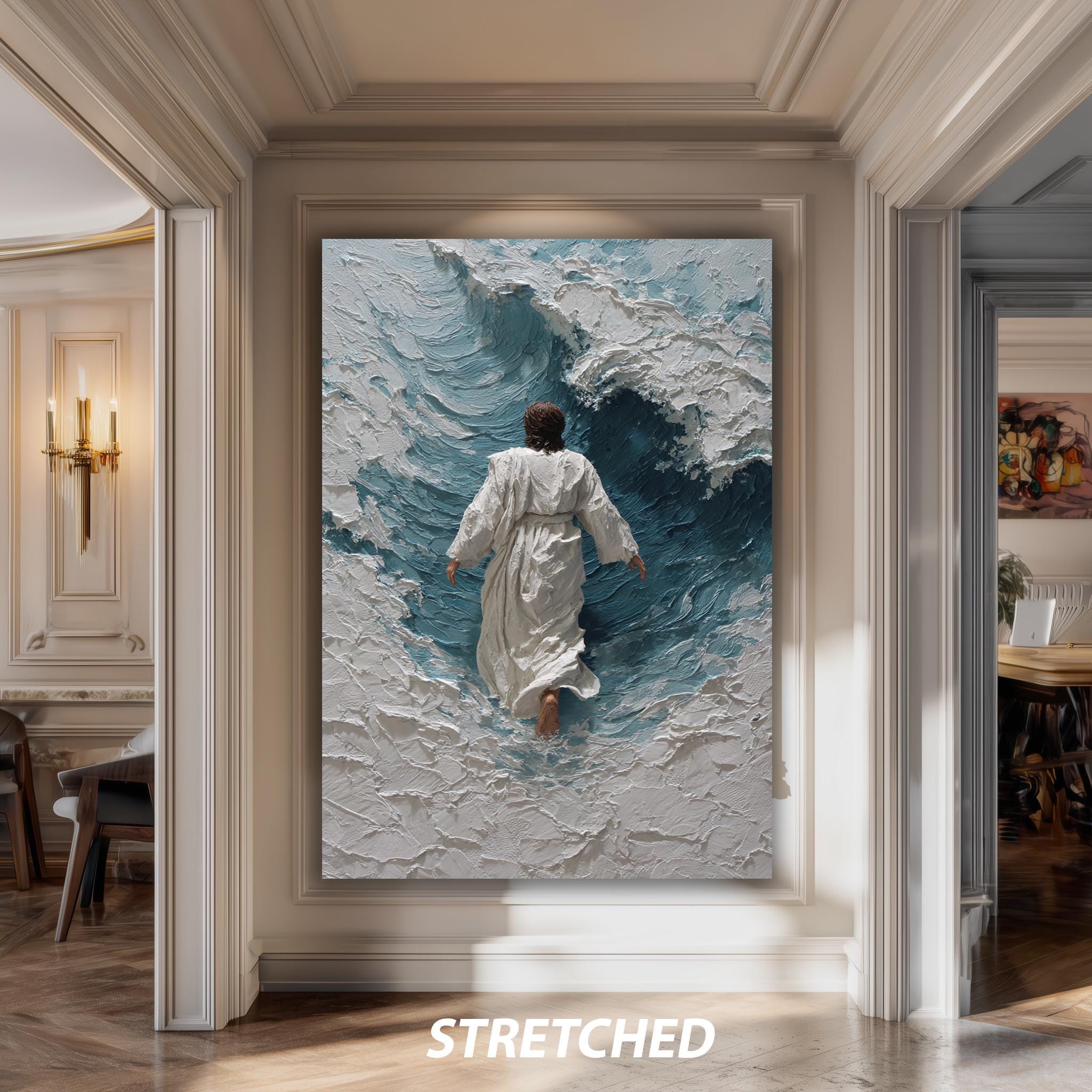 Elevate your spiritual home decor today with this unique Jesus walking waves art piece that combines timeless biblical themes with sophisticated abstract expressionism.