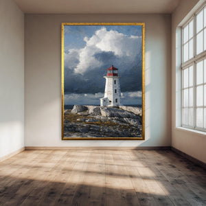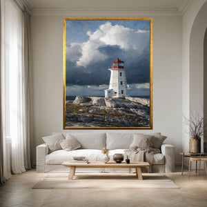 This classic lighthouse art print captures the striking beauty of a dramatic sky and rocky coast, making it an ideal nautical home decoration that brings timeless charm to any space. Printed on premium canvas, this ocean landscape poster delivers vivid colors and fine details that highlight the marine theme painting’s bold contrasts and natural textures. Measuring from 8"x12" (20x30cm) up to 59"x98" (150x250cm), this beach house art print fits perfectly in living rooms, bedrooms, or offices seeking minimalist coastal decor with a sophisticated edge.