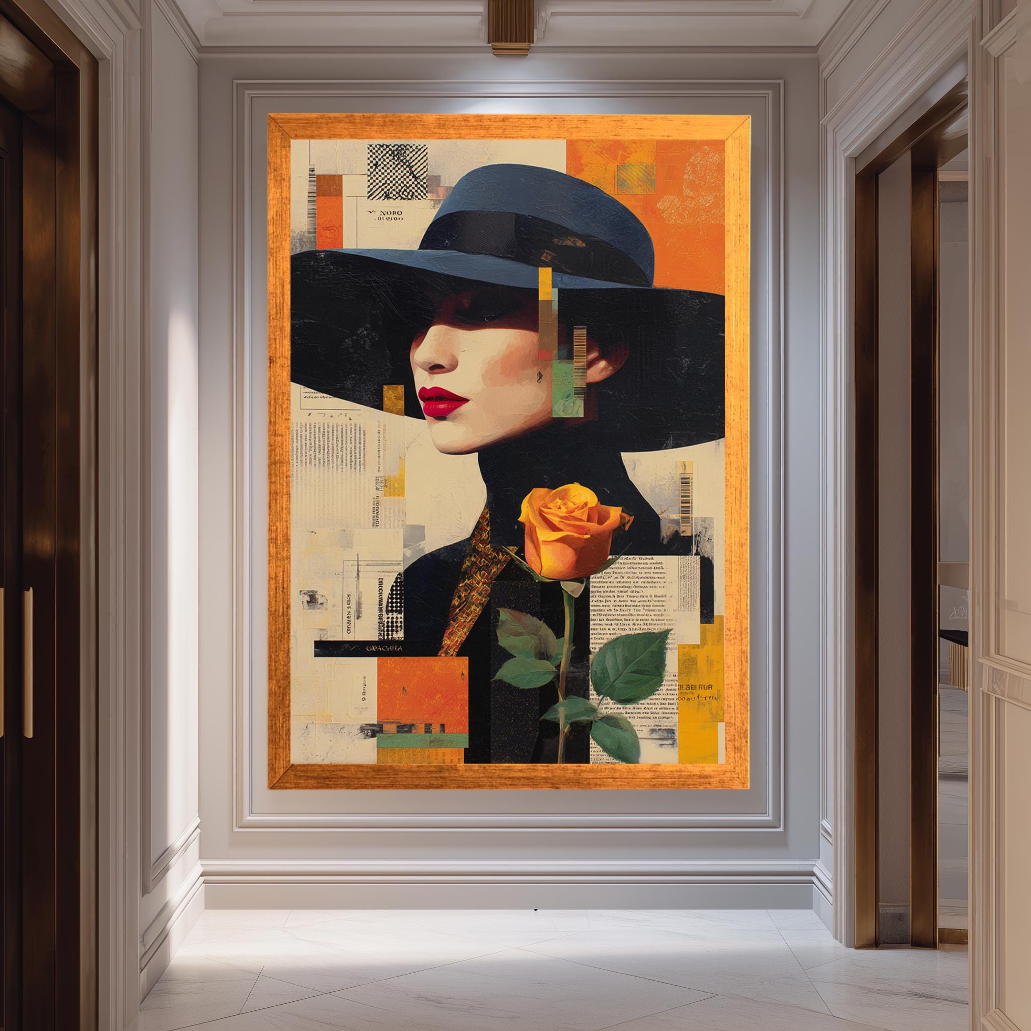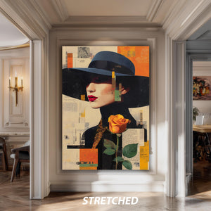 This modern abstract woman portrait captures the essence of contemporary art with a striking digital collage art design featuring a yellow rose artwork and a black hat portrait. This canvas art print delivers vibrant color blocking and emotional depth inspired by abstract expressionism print and color field painting techniques, making it an ideal fashion wall decor piece for minimalist wall art and contemporary home decor lovers. Printed on gallery wrapped canvas, this modernist art poster combines sophistication with bold visual drama to transform any space.