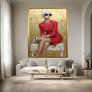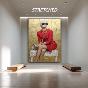 This modern glam wall art titled "Modern Glam Woman in Red Dress with Gold Background" is a luxurious fashion wall print designed to elevate any space with its stylish female portrait and bold color painting. Crafted as a gallery wrapped canvas, this red dress artwork delivers a striking presence that blends abstract expressionism print techniques with elegant female art. Perfect for those seeking luxury wall decor or minimalist wall decor, it enhances contemporary interiors with mid century art influences.