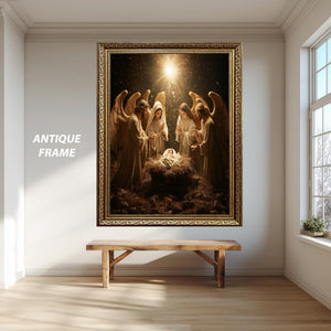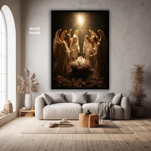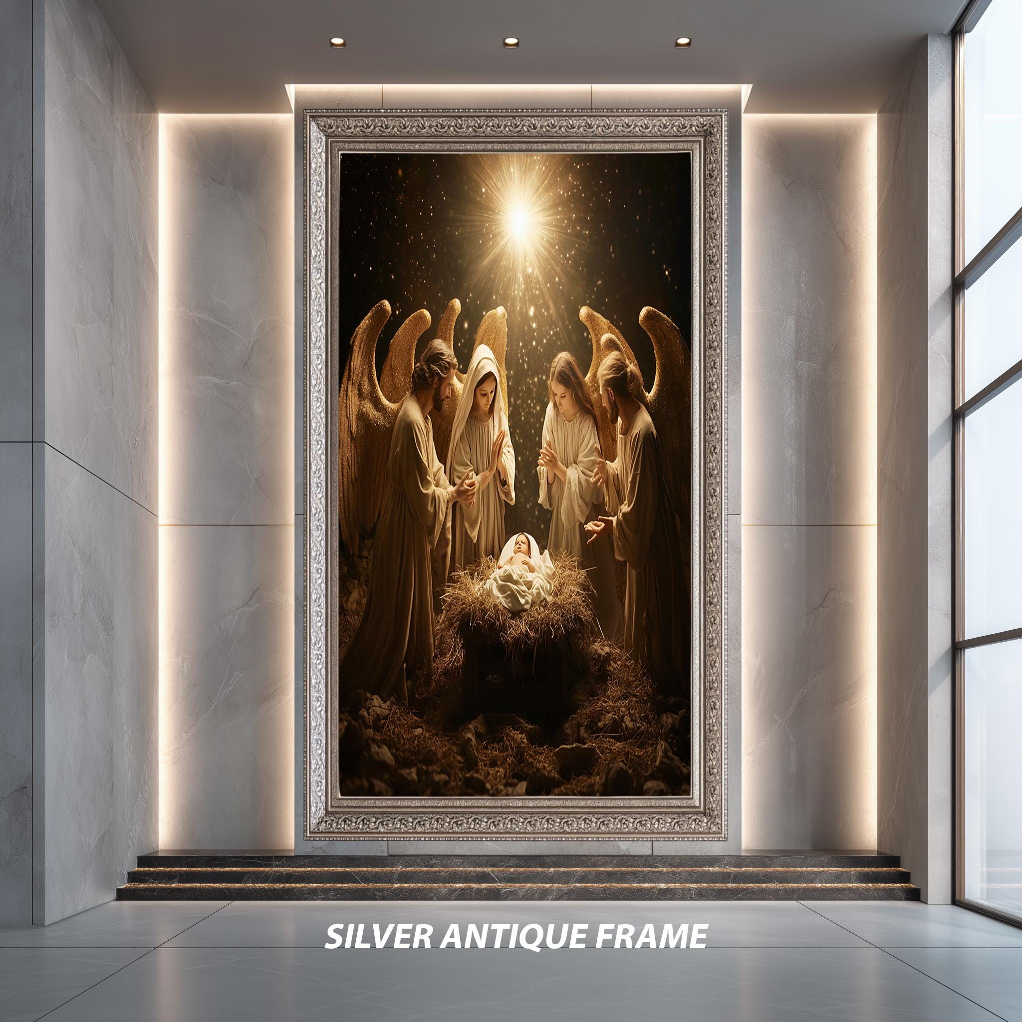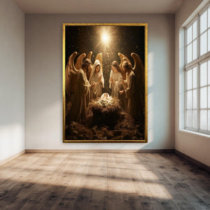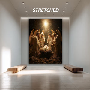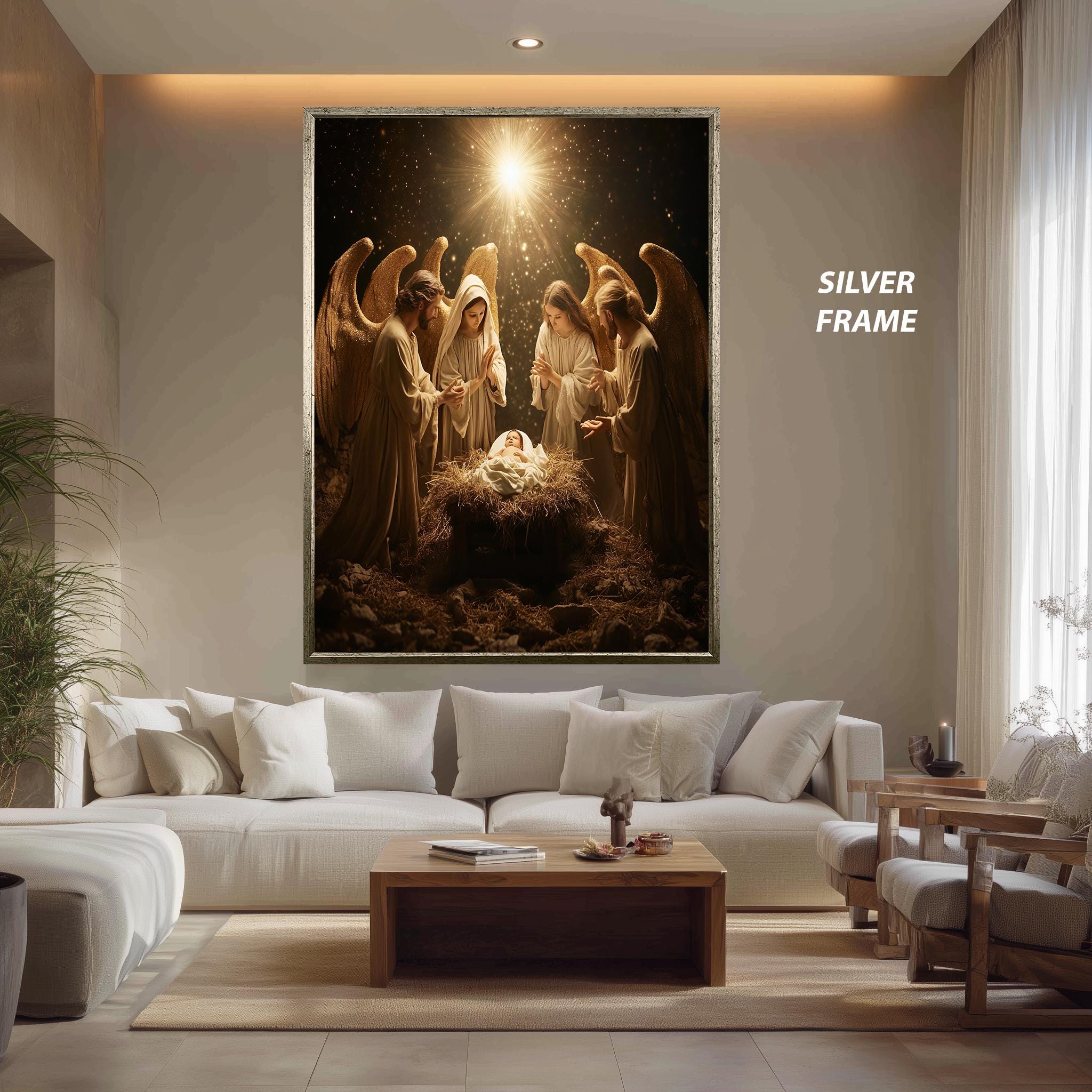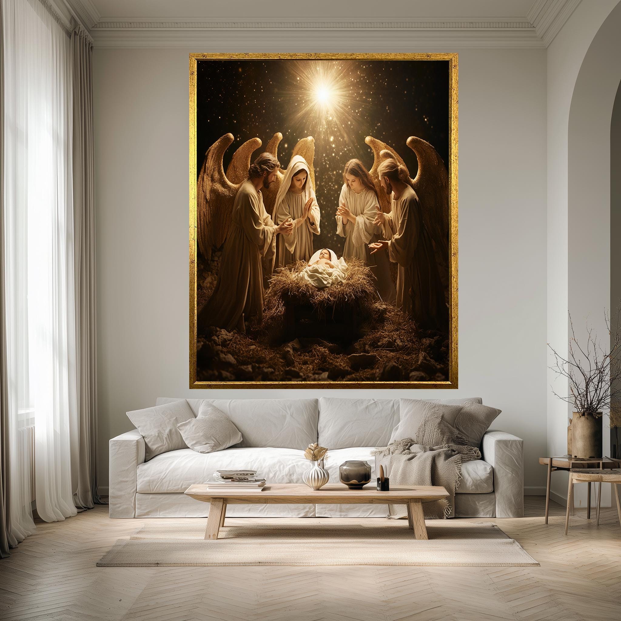 This nativity scene canvas beautifully depicts the holy birth of Jesus, creating a meaningful focal point for your Christmas wall decor. Featuring the holy family art with baby Jesus artwork and angel wall hanging elements, this religious canvas print brings sacred birth print imagery to your home. The manger scene canvas captures the faith based decoration spirit, making it an ideal piece of Christian home art and holiday religious decor.