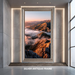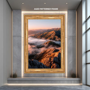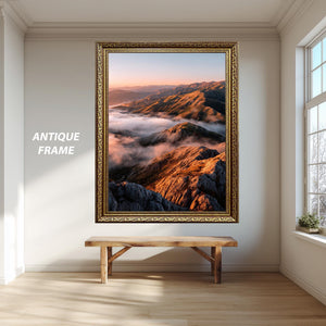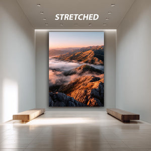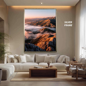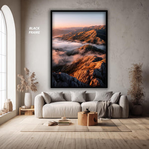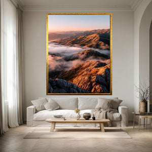 This nature landscape print titled Golden Sunrise Over Mountain Peaks and Misty Valleys captures the serene beauty of an early morning outdoor scene poster, bringing a peaceful wall art experience to your home or office. Featuring a sunrise landscape with golden hour print tones, this scenic wall print highlights misty mountain views and valley cloud print details that evoke calm and inspiration. Perfect for nature lovers seeking hiking decor art or a calming landscape centerpiece, this mountain wall art blends vibrant colors with tranquil imagery to transform any space.
