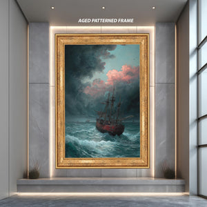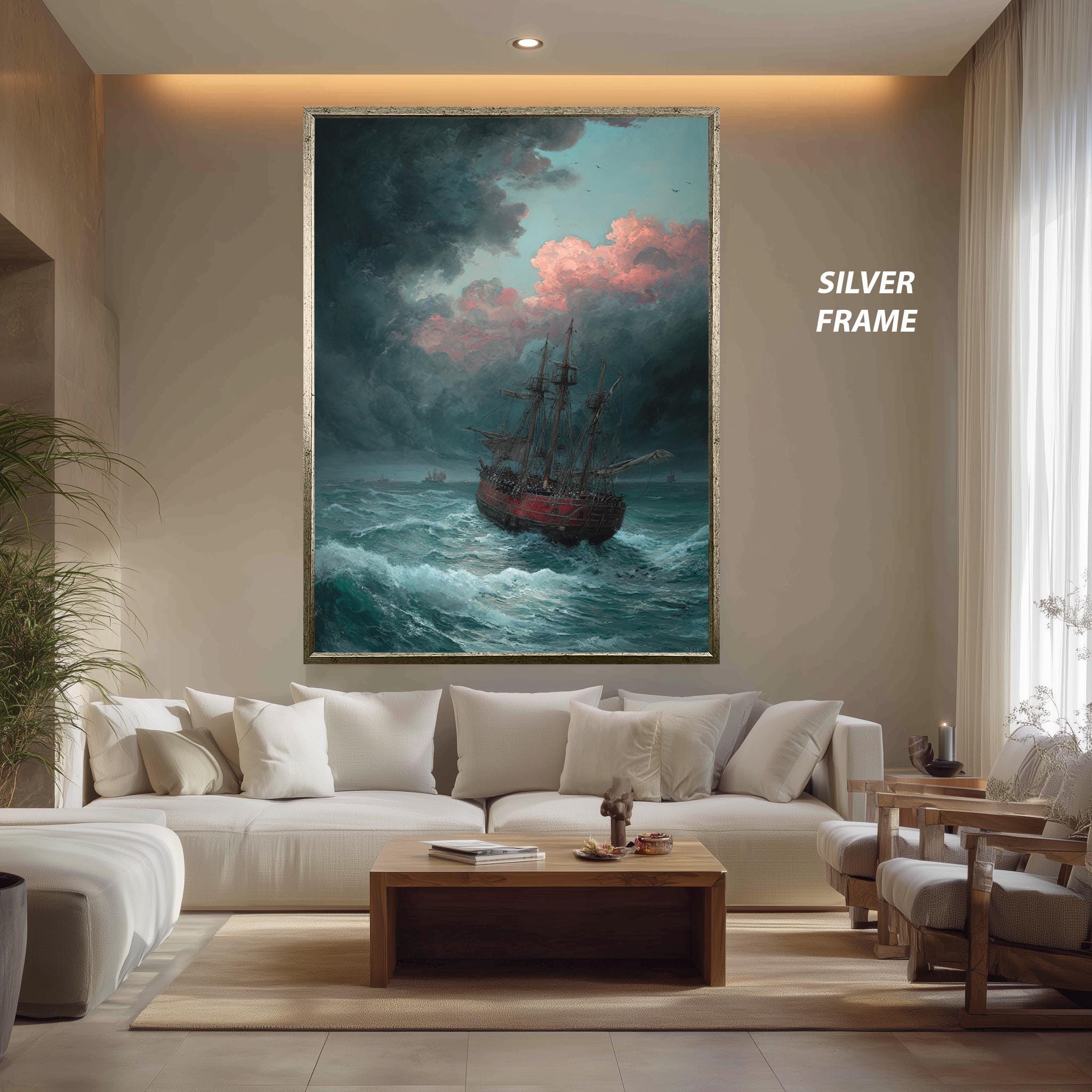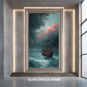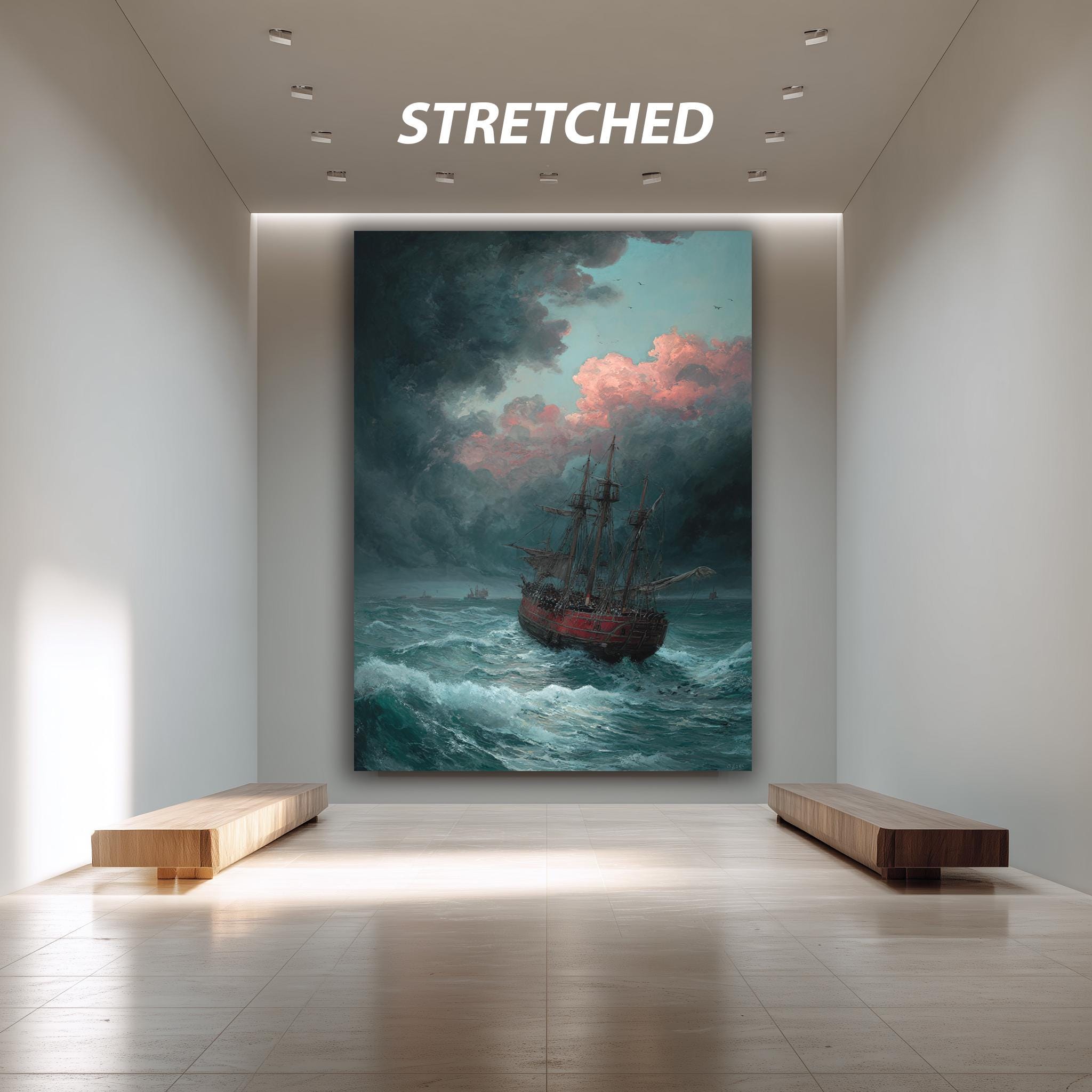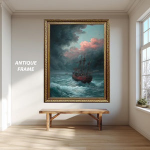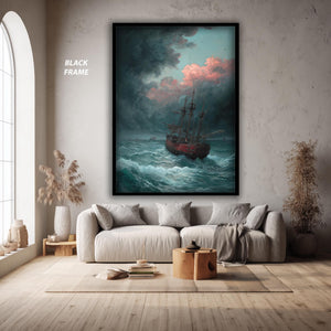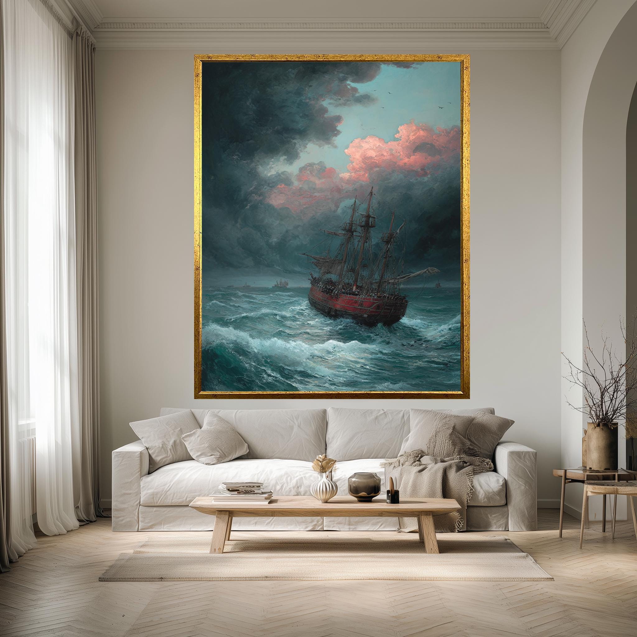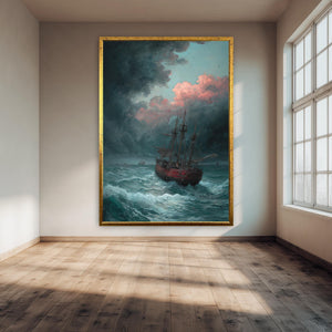 Embrace the drama of the sea with this stormy sea painting featuring a red sailboat sailing beneath a dramatic sky painting. Add this unique piece of nautical wall art to your collection today and transform your space with the timeless allure of the ocean.