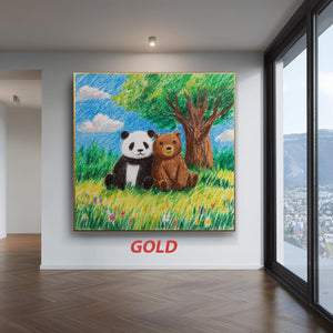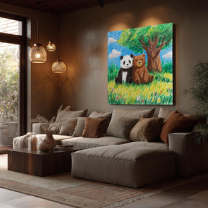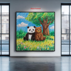This Cute Panda and Brown Bear Crayon Art Print Sitting in Meadow is charming panda bear wall art designed to brighten any nursery or kids room with adorable animal friendship. This crayon style artwork captures a whimsical nature scene poster featuring a panda and bear sitting peacefully together in a pastel color print, creating a warm and inviting atmosphere for baby room artwork or any space needing a touch of joy.