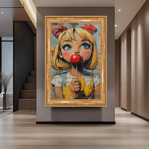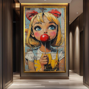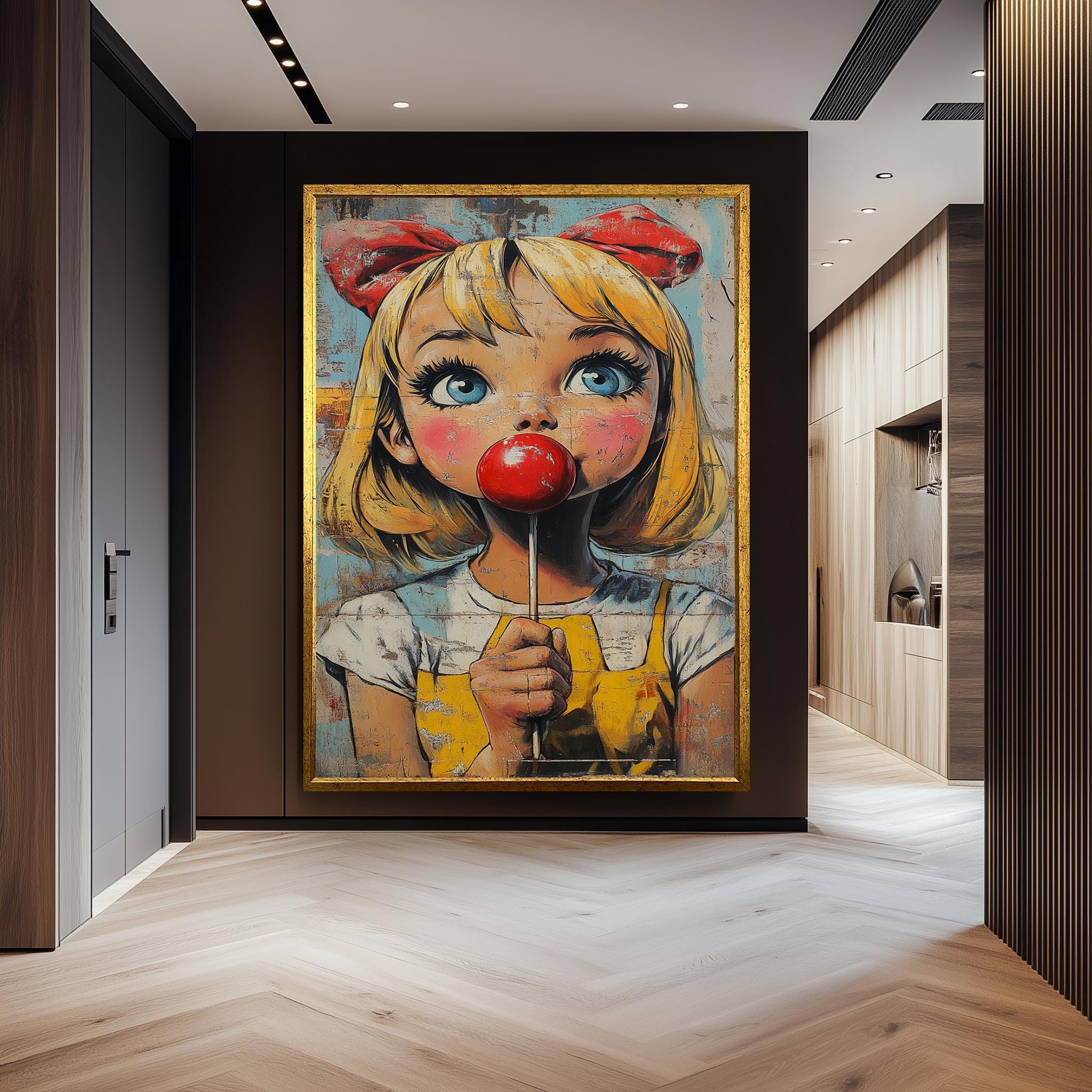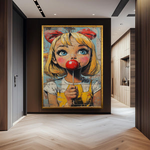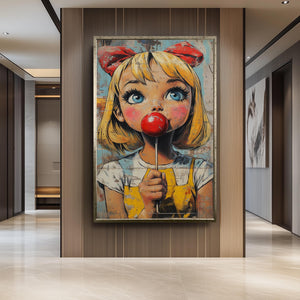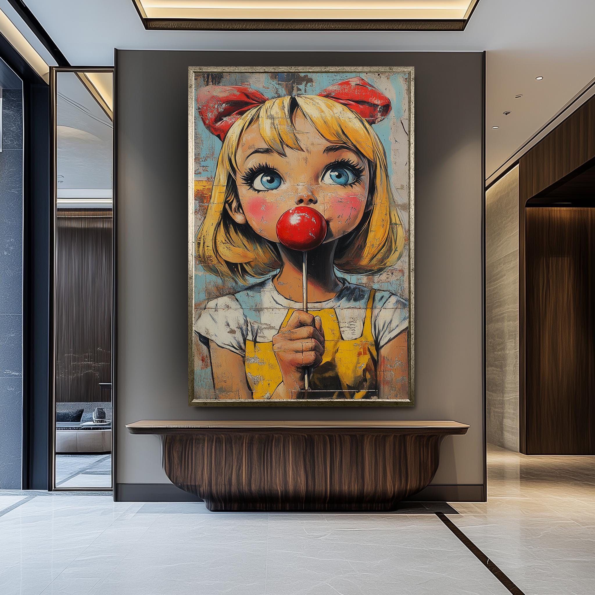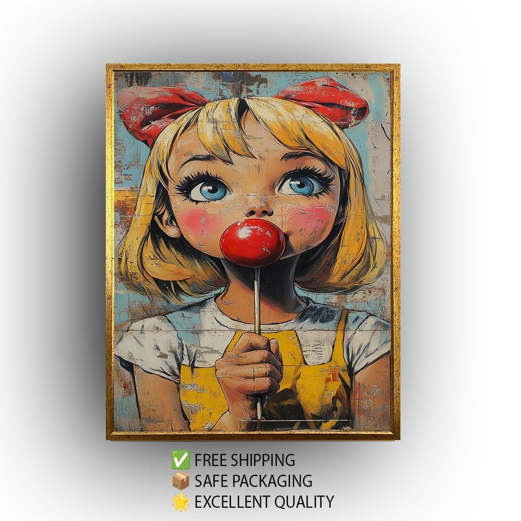 This pop art girl canvas features a vibrant and playful girl with a giant red lollipop, blending retro comic wall art style with bold colorful artwork that enlivens any room. This colorful canvas print captures a whimsical cartoon portrait with bright distressed textures that combine vintage cartoon decor and modern pop culture art, making it an ideal choice for those seeking playful feminine art with a nostalgic twist. Perfect for kids room wall decor or creative adult spaces, this girl with lollipop print adds energy and charm wherever it’s displayed.
