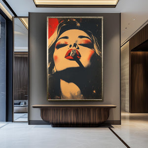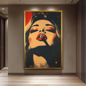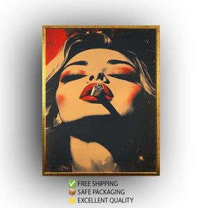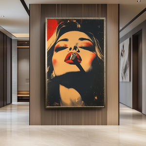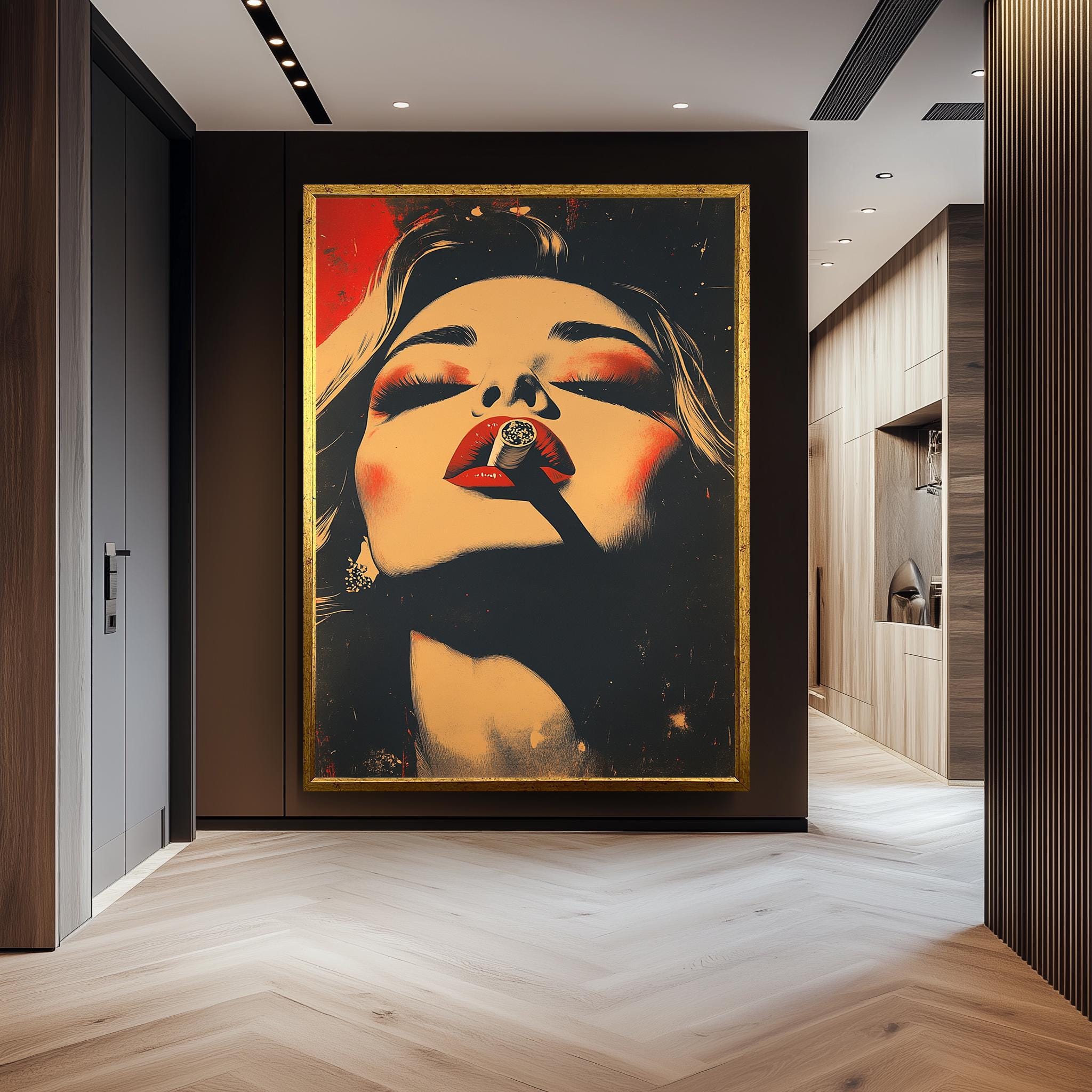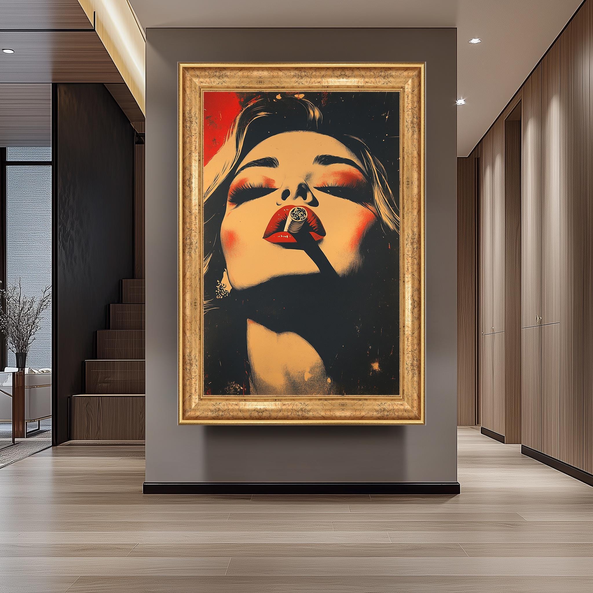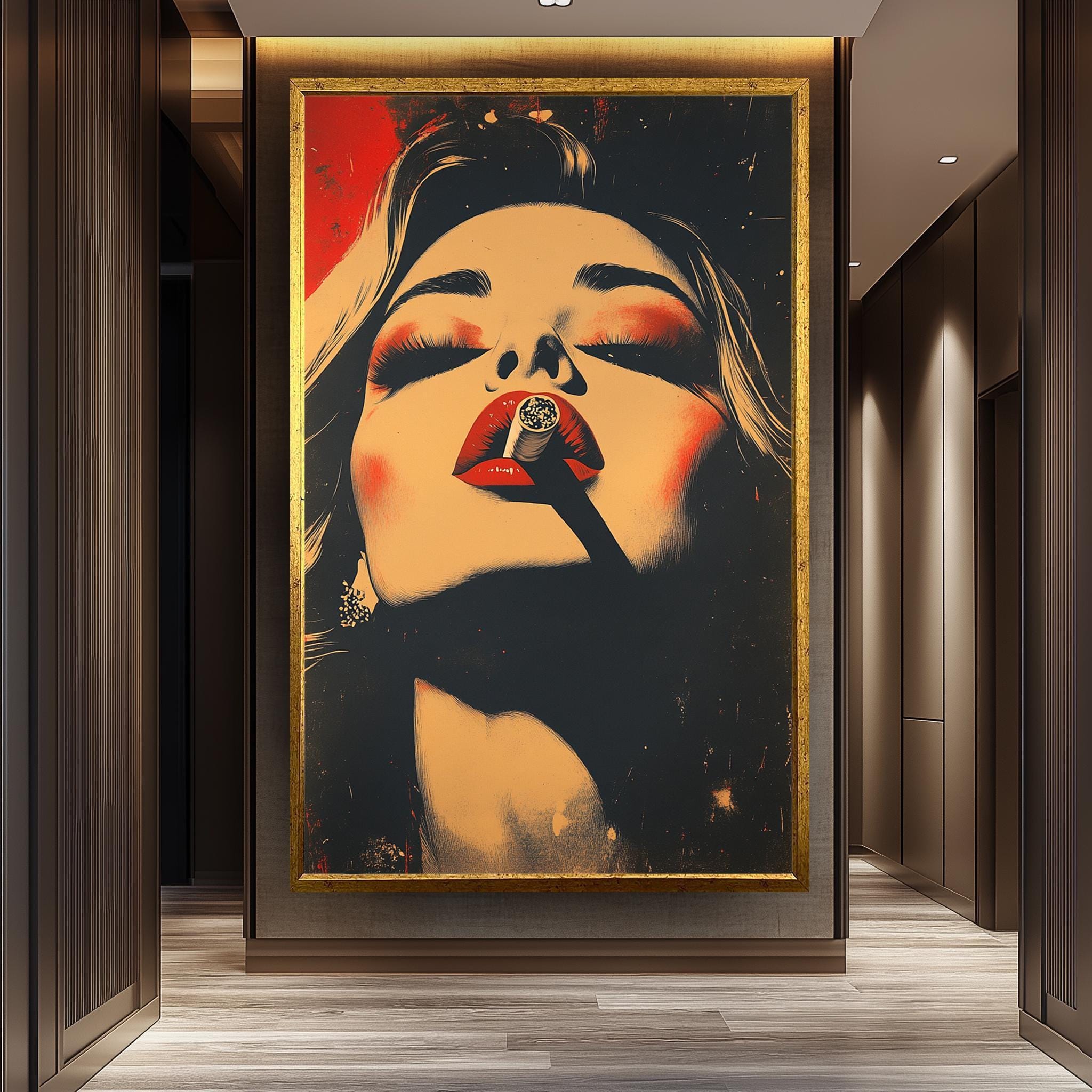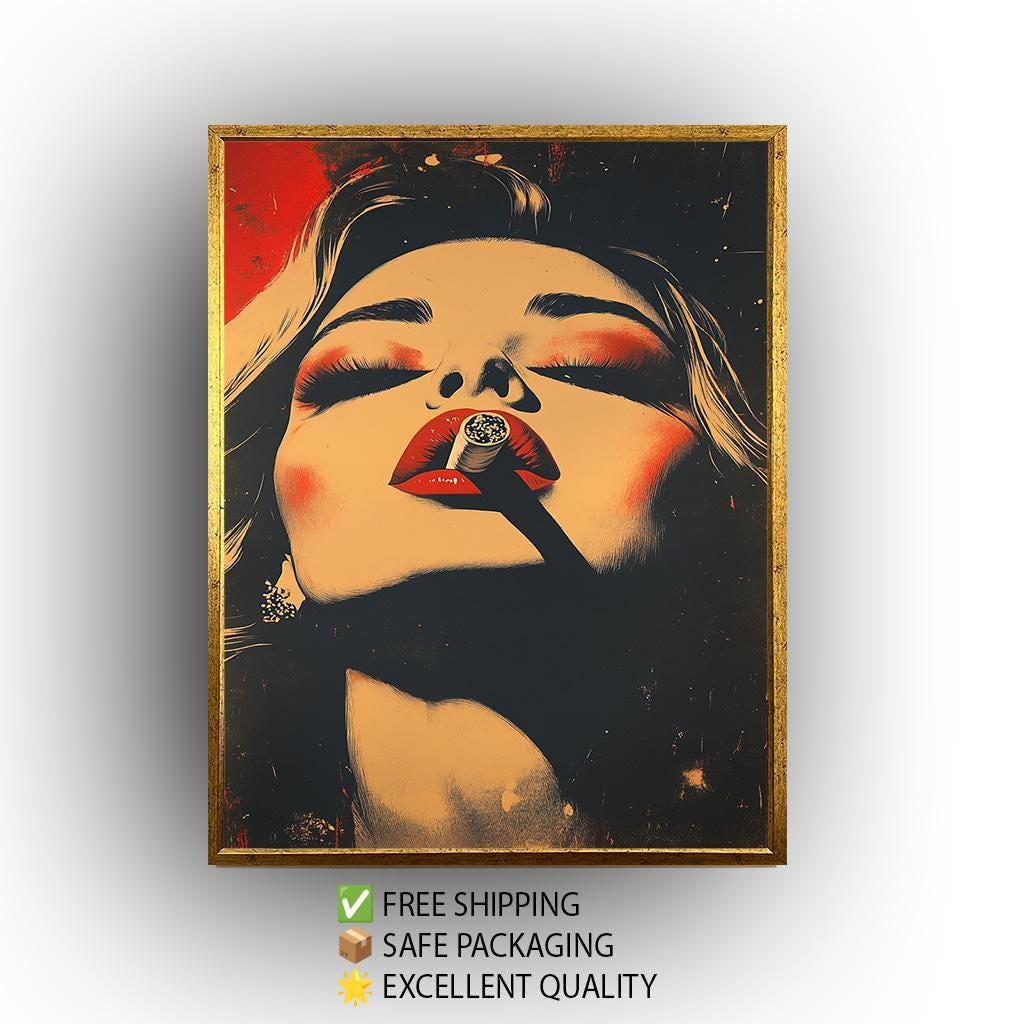 This glamorous woman pop art wall print captures a dramatic, retro noir style portrait that brings bold colorful decor and fierce feminine power into your space. Featuring a striking close-up of a vintage smoking lady with vivid red lips wrapped around a lit cigarette, this high contrast print blends modern pop art print techniques with classic noir style artwork to create an unforgettable statement piece. Perfect for fans of femme fatale wall art and retro wall art, this custom canvas art delivers a dramatic woman portrait that energizes any room.