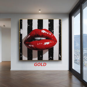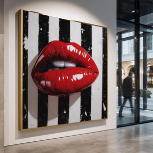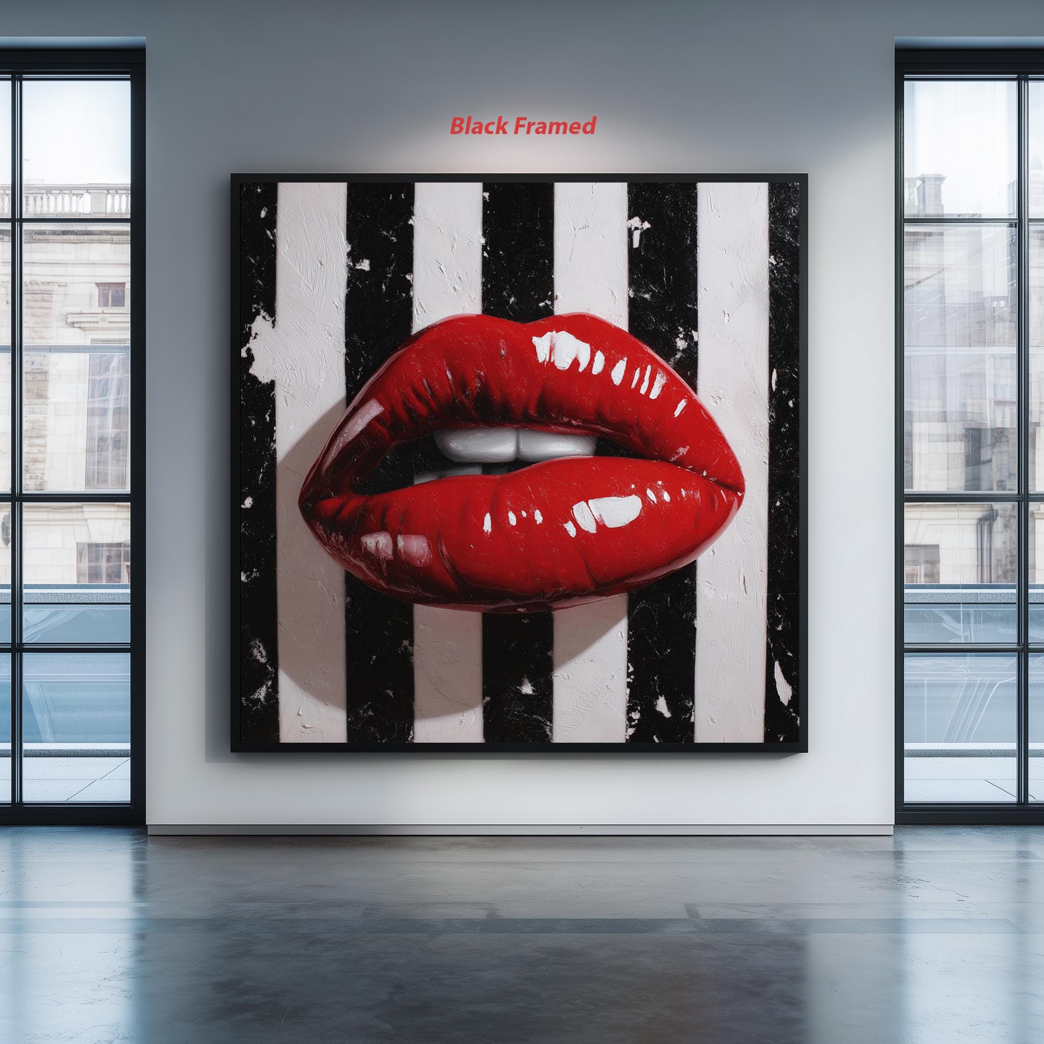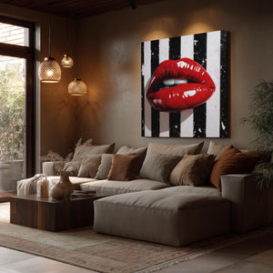 Bring home this modern glam decor piece today and enjoy the perfect fusion of edgy style and artistic expression. Its bold red lips motif combined with sleek black white poster stripes makes it a must-have for anyone looking to amplify their fashion lover decor with confidence and flair.