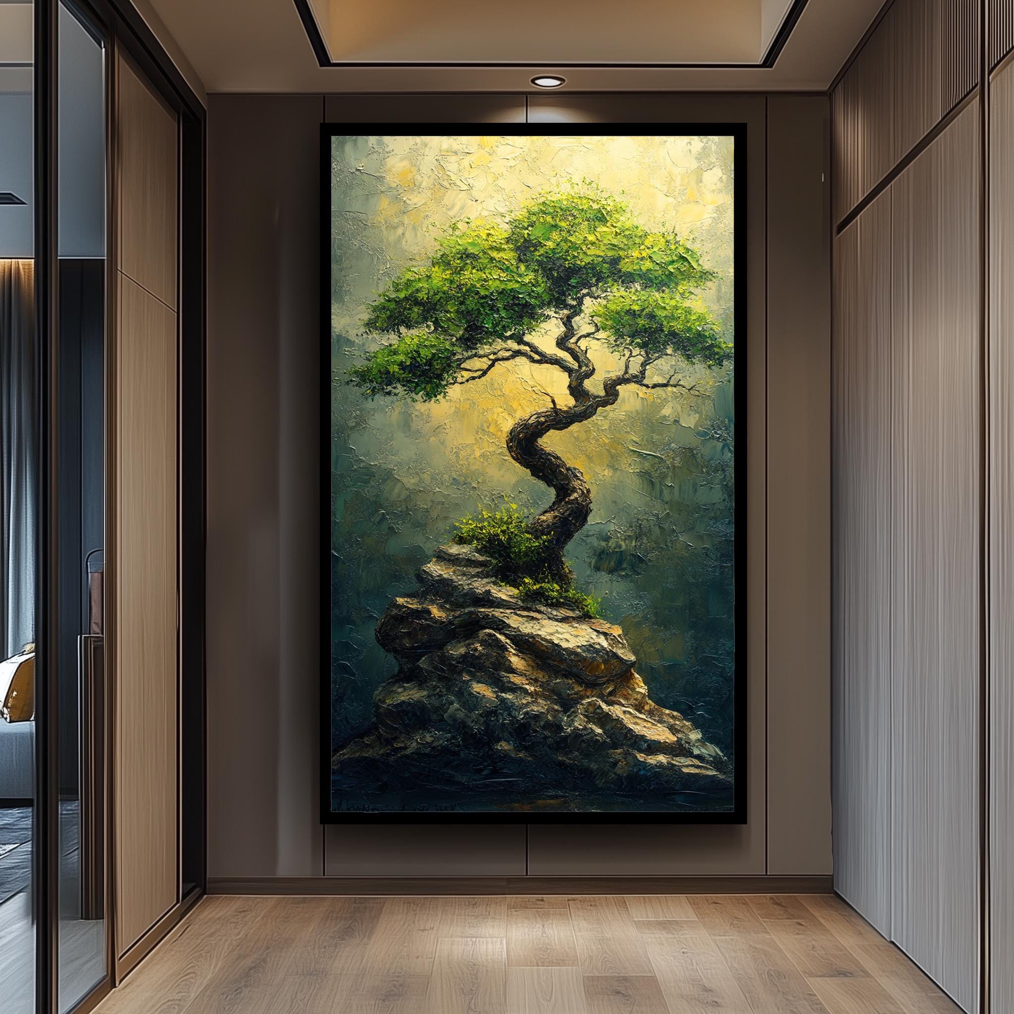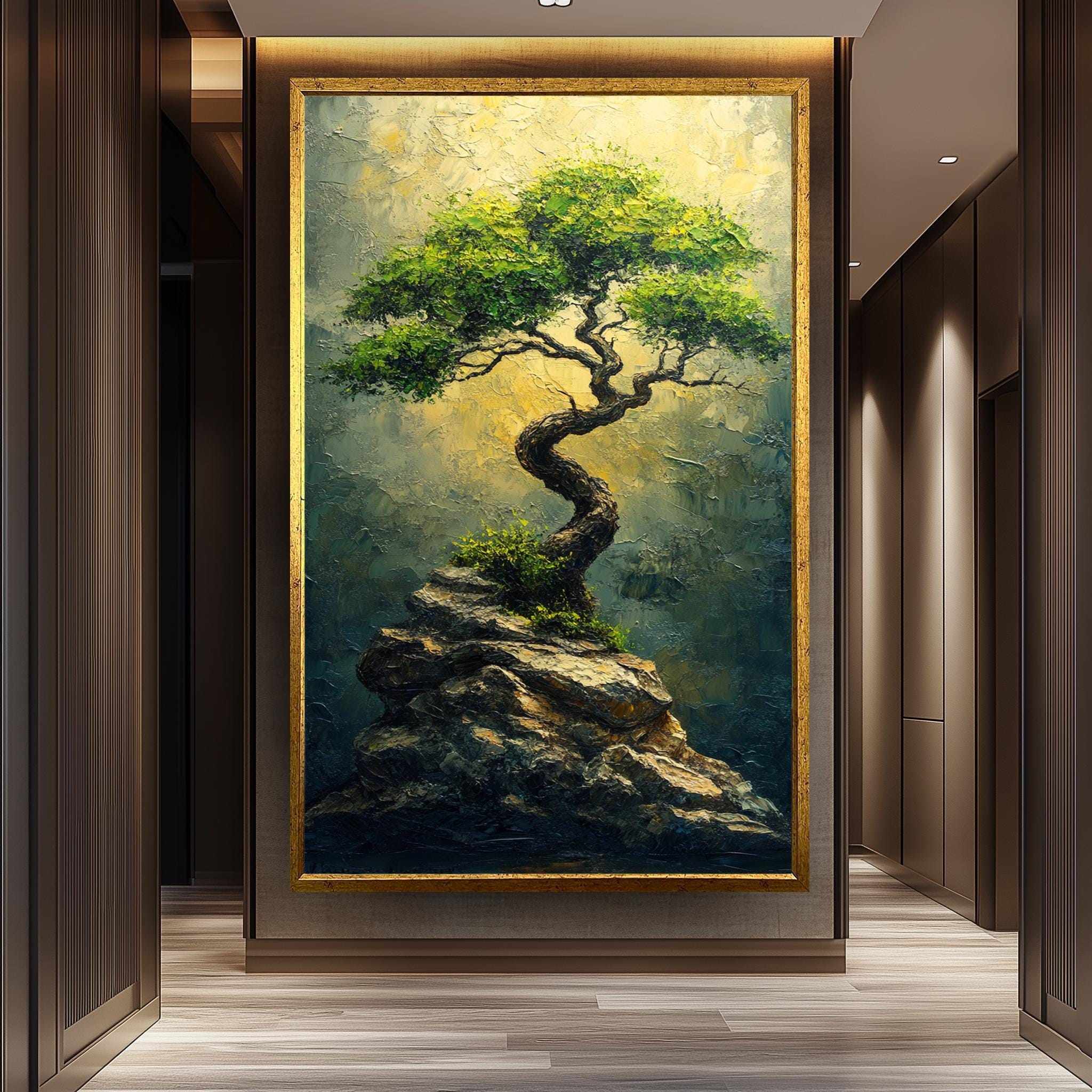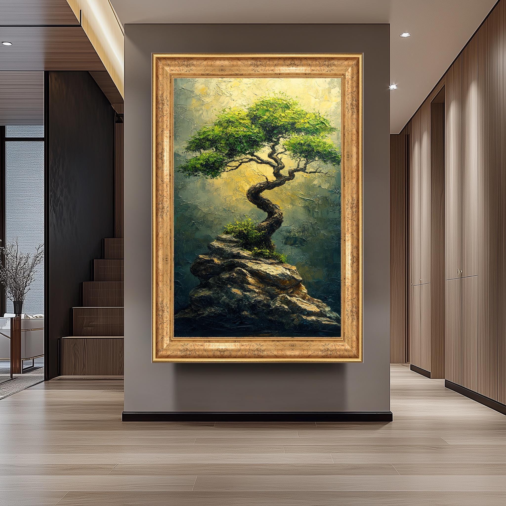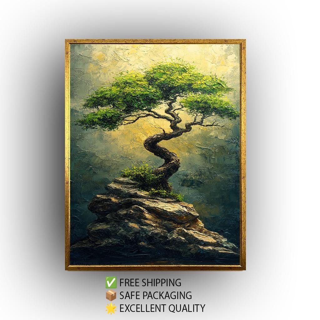 This nature wall art features thick brushstrokes that add depth and life to every leaf and rock, creating an inspiring landscape art piece that transforms any room. The golden light artwork enhances the tranquil atmosphere, while the twisted tree painting symbolizes resilience and growth. Crafted with premium materials, the hand-stretched canvas ensures durability and a flawless finish that resists warping over time.